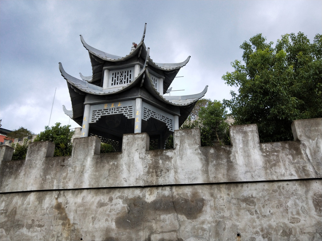 沿着砖墙往前走,居然有一段城墙,不过这应该是后来建的,不是用砖或石块垒起来的,外面覆着水泥。墙内是一座亭子,仿古的式样,六角重檐,通体灰色,看上去简洁大方。亭额上也有名字:“玉兰亭”,不过我看了一下周围,似乎并没有栽种玉兰树,大约人家要的只是玉兰这个意象吧。