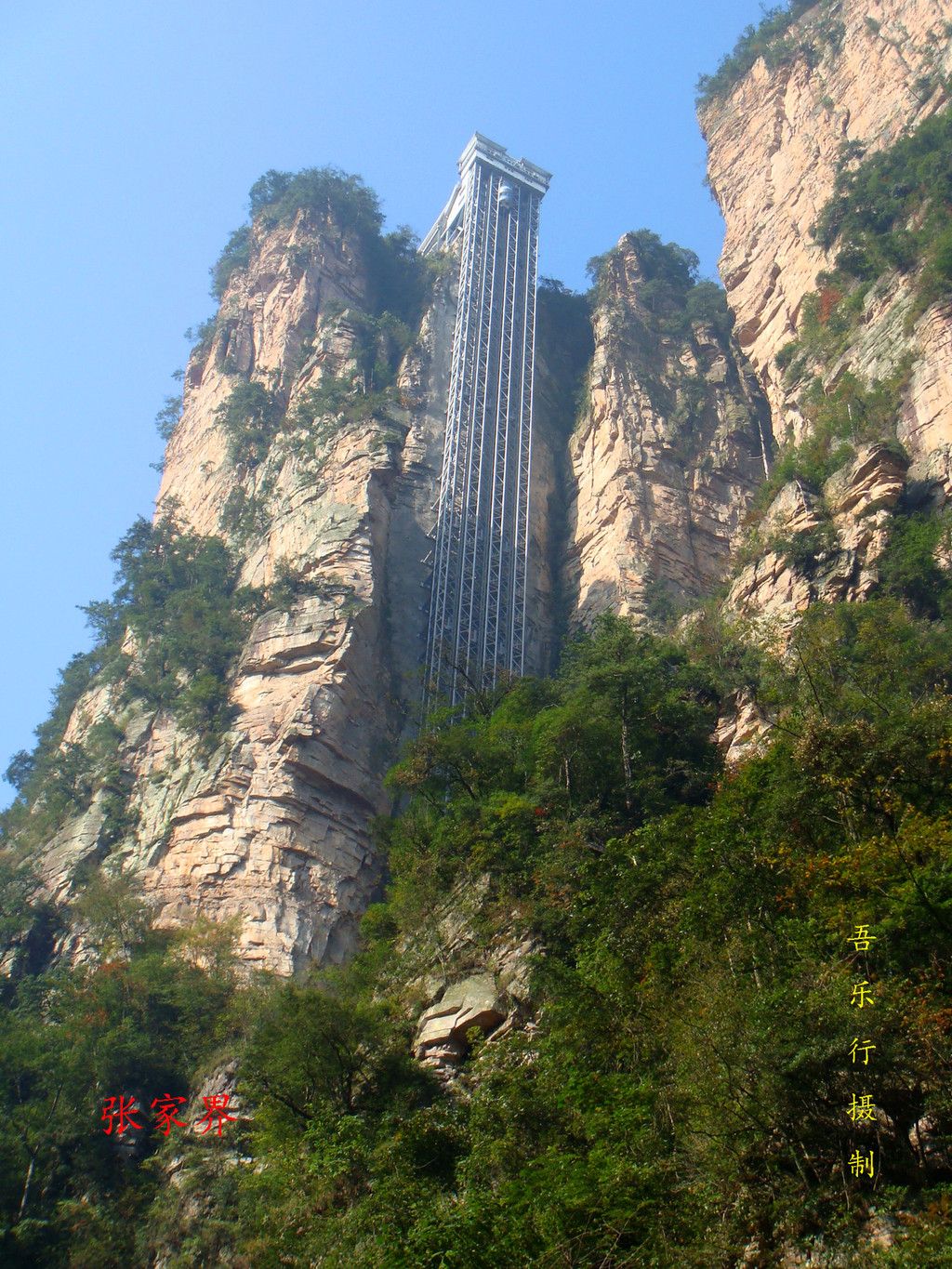 百龙天梯通过垂直距离335米的高差,将袁家界与金鞭溪紧密联系在一起,运行速度达到3米/秒,运行高度326米
