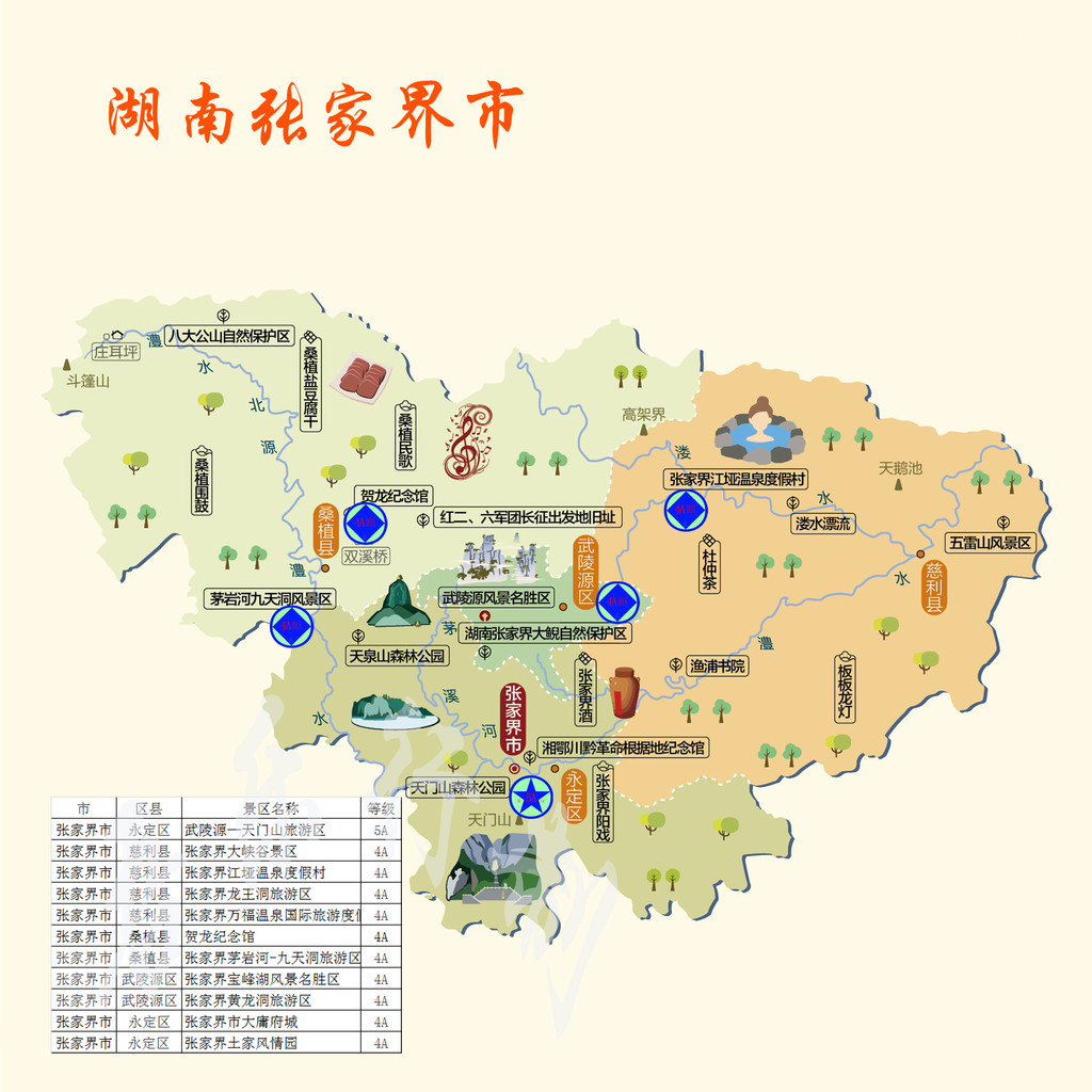 天子山景区包括石家檐、茶盘塌、老屋场、鸳鸯溪、黄龙泉、凤栖山等六个小景区