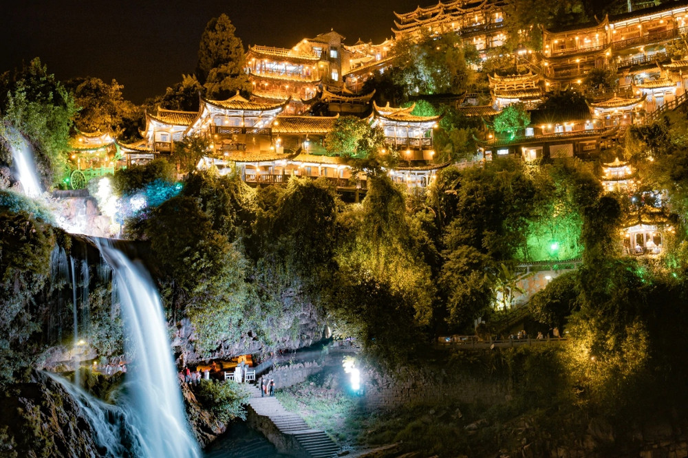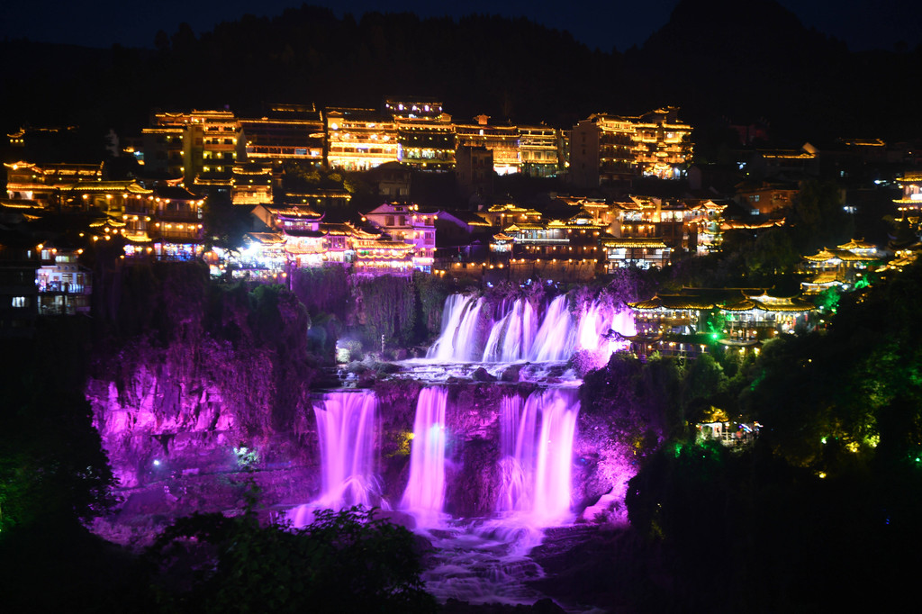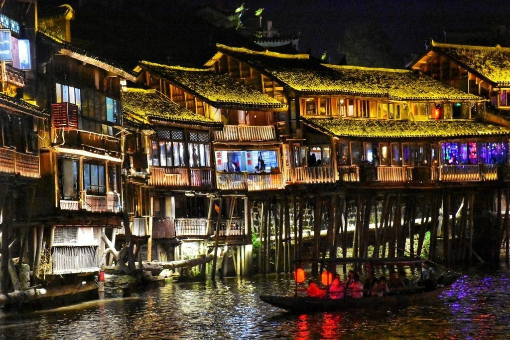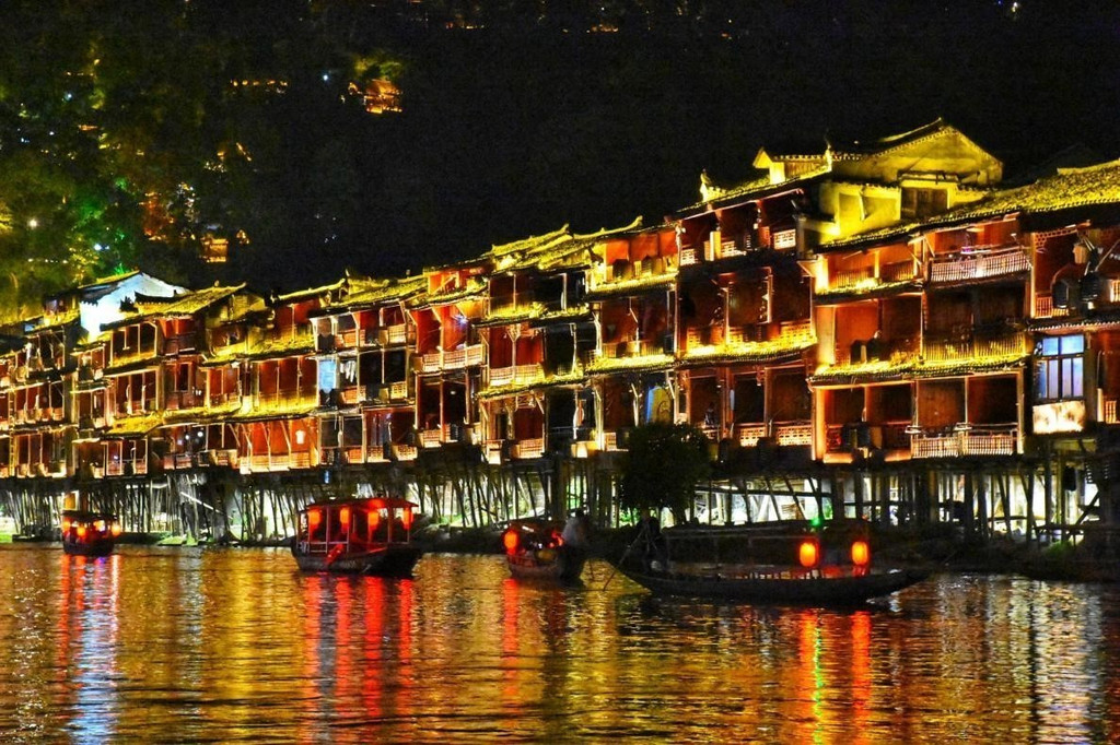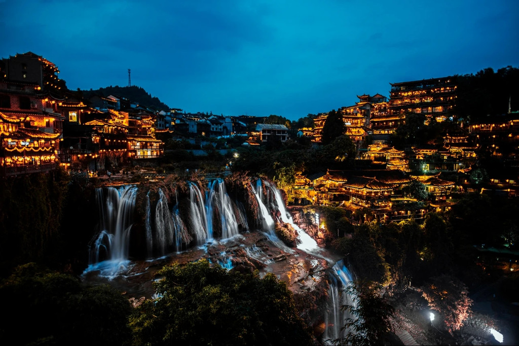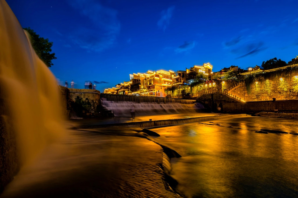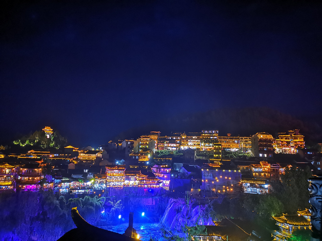 逛完古村,太阳渐渐偏西,正好掉头去抖音网红瀑布所在地:芙蓉镇。朋友说芙蓉镇原名叫王村,因《芙蓉镇》在此拍摄,所以改名为“芙蓉镇”。从矮寨收费站上高速,延着高速一直行大概一个小时,就到了芙蓉镇。此时夜色降临,芙蓉镇的灯光瀑布真的太美了,尤其是坐上船游酉水河从瀑布正面经过时,才发现这灯光瀑布美的不像话,瀑布两边建造着挂在悬崖上的土家吊脚楼,船上的船工有些自豪:这算啥,我们湘西还有很多美景的,有机会我带你们到更贴近大自然的地方看看。