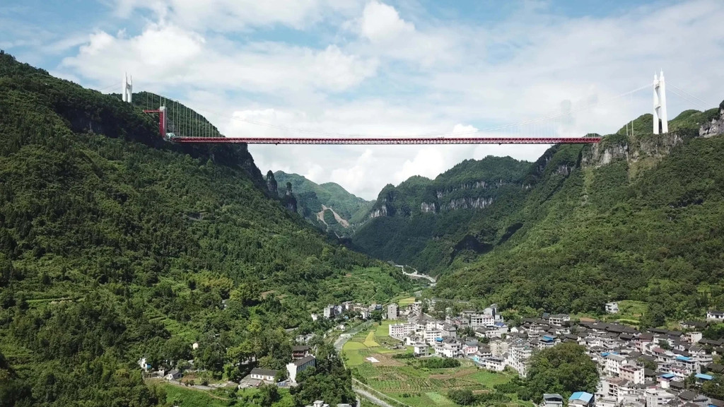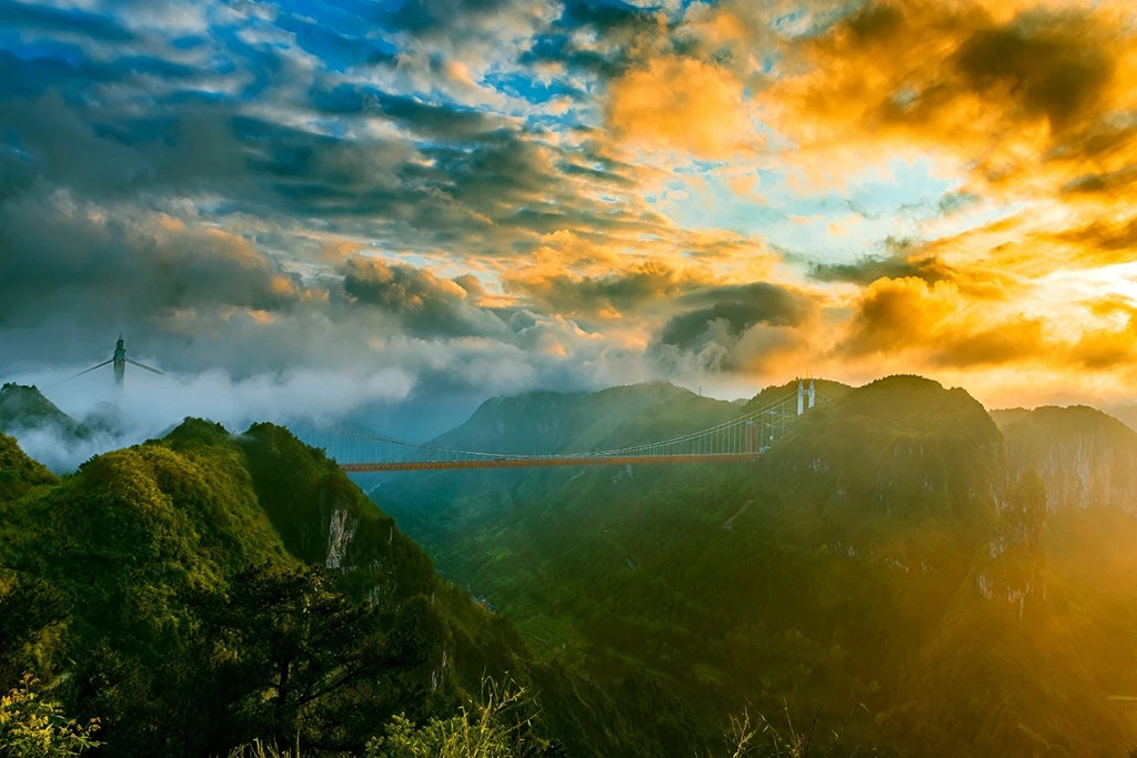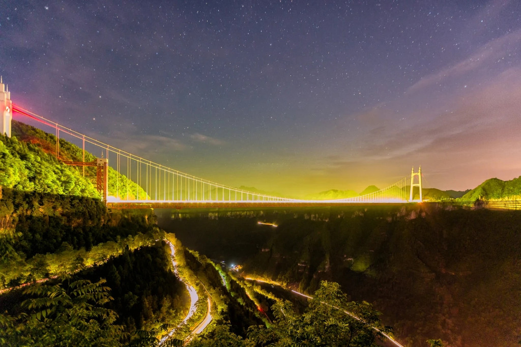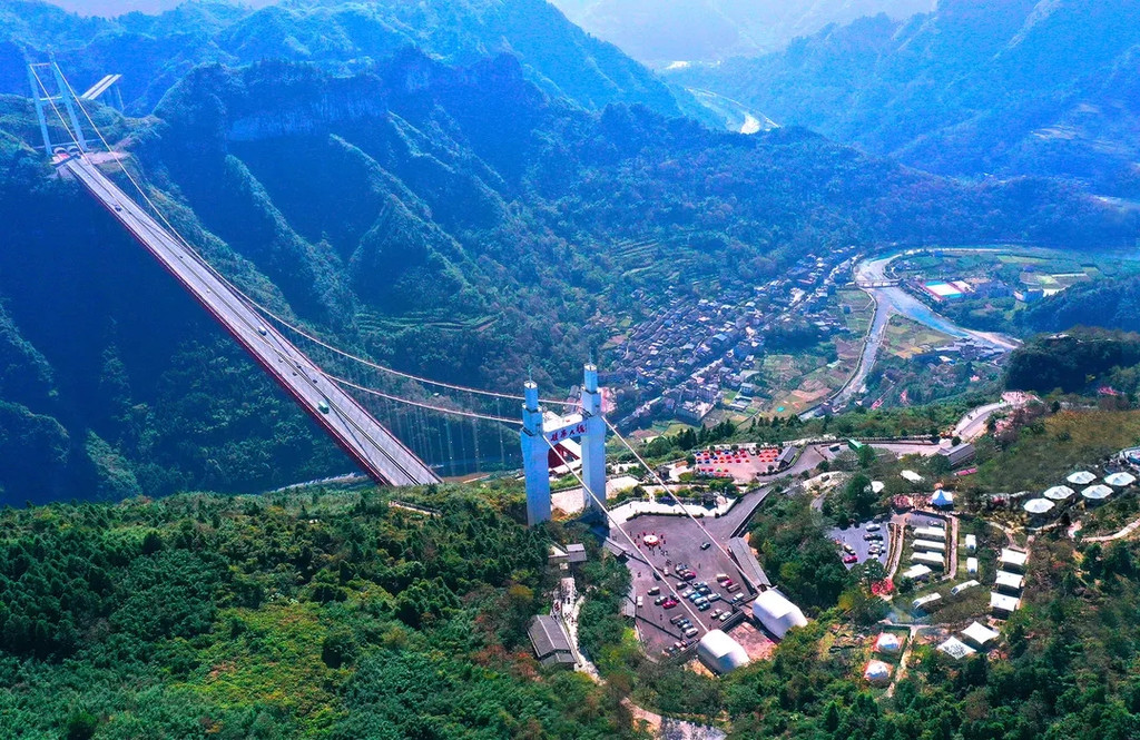 车辆渐渐驶入矮寨大桥,进入大桥时眼前的一幕不得不让我震惊当今的祖国建造力量,只能用荡魂摄魄,震撼心神来形容我当时的感觉,朋友介绍说矮寨大桥有四之最,1.世界横跨峡谷最长的悬索桥;2.世界最先采用塔、梁完全分离的结构设计方案的大桥;3.世界最先采用“轨索滑移法”架设钢桁梁的大桥;4.世界最先采用岩锚吊索结构,并用碳纤维作为预应力筋材的大桥。