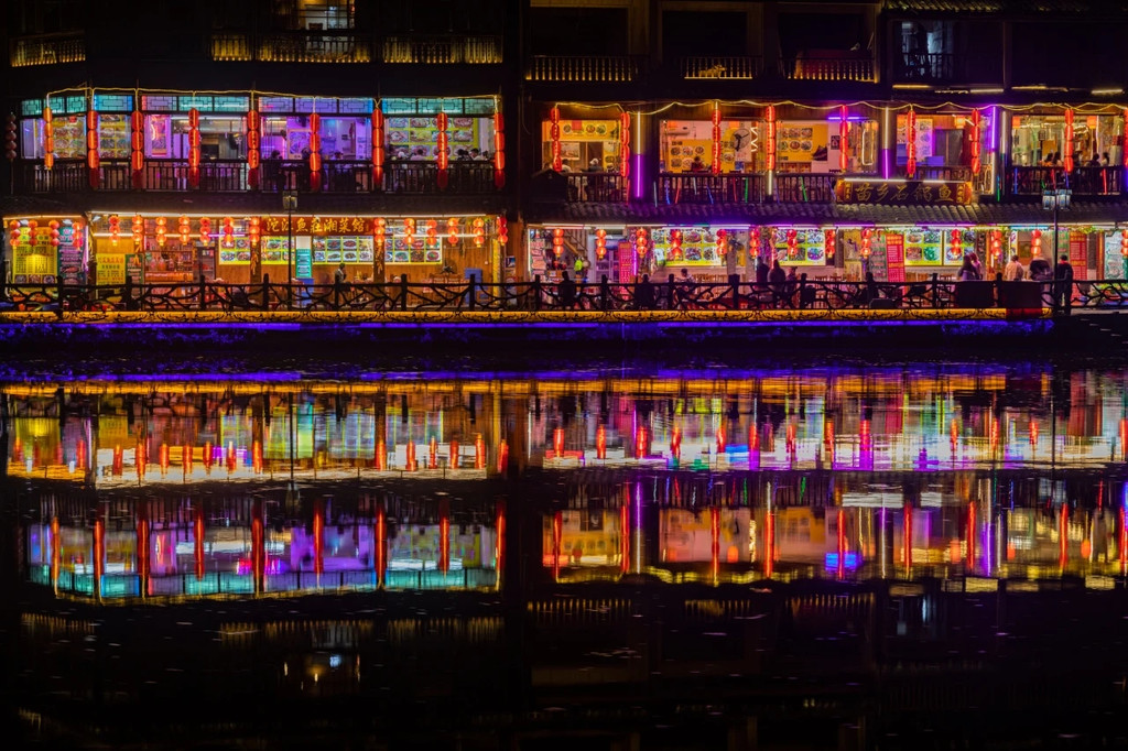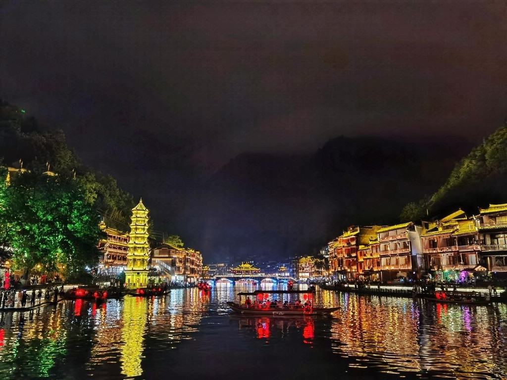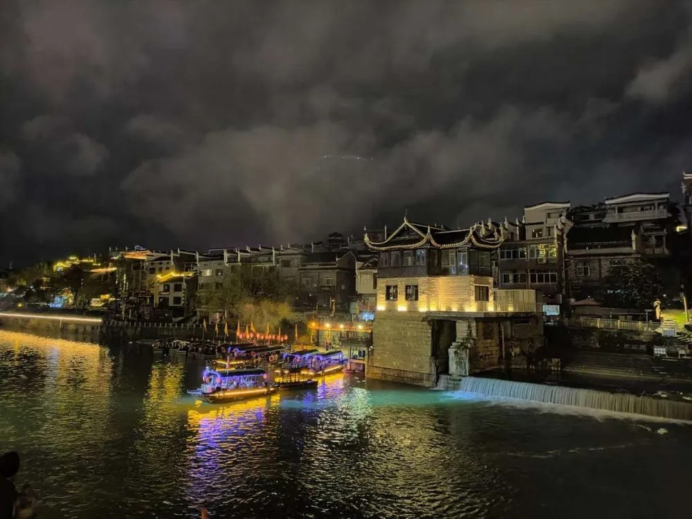 夜幕降临吃完本地特色血粑鸭,我们计划的晚上八点返程临时推迟一小时,只为看一眼这座古城的夜景。到了古城外面路上拥堵着,见车流一直没动索性走路进去,还以为会有多远,没想到拐了个弯一个悬挂了万千五光十色灯光的凤凰展现在我们面前,凤凰的夜景颇有治愈人的作用。一间间精致的客栈小屋透着诗意浪漫的古城情怀,枕着湘西小城的恬静柔美入眠。等古城的夜,也等你来。夜幕降临,山峦在黑暗中渐渐消失,凤凰披上了一层神秘的面纱,沱江岸边的吊脚楼,苍劲古朴的万名塔,飞檐翘角的风雨楼,还有迎风摇曳的大红灯笼,不断向人们讲述着古城过去和现在的故事。九点降至,即将返程。。。