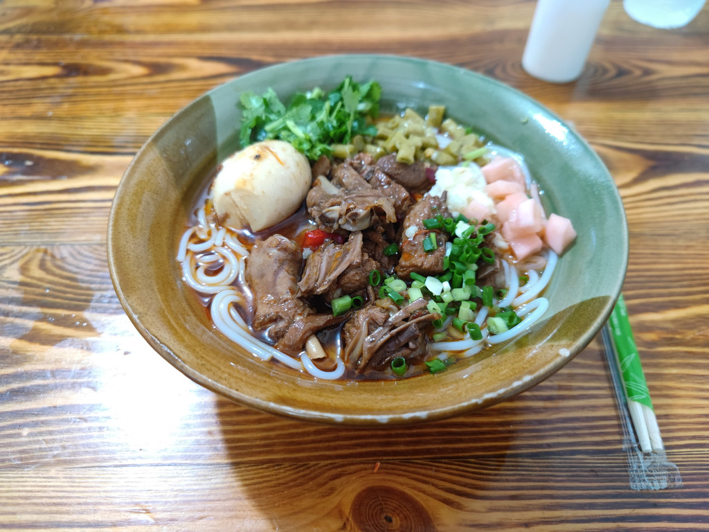从乾州古城回来,肚子有点饿了,酒店服务生推荐我去酒店旁边的粉馆的吃碗正宗的吉首米粉。吉首米粉是吉首的特色小吃,选用新鲜的猪骨和大锅里熬底汤。这家店很小的一个门面,但是客人络绎不绝,门面挂着一副粉店老板和一位明星的合照,看来这家店也是米粉中的人气店。十几种炒码任选,不得不说湘西人真的实在,我点的鸭子粉,粉店老板打的鸭子码几乎盖满了碗面,才10元钱一份,味道那是相当独特,到现在为止我还在想下次去吉首时一定要再来嗦碗粉。昨晚嗦粉忘了拍照打卡,早上一早赶过去拍照
