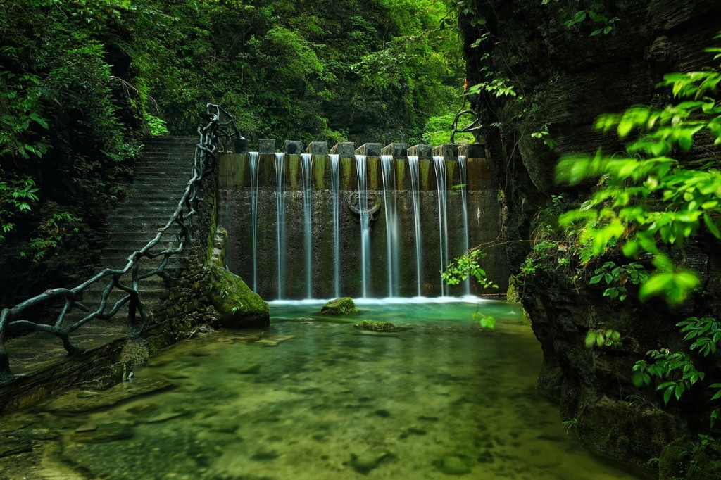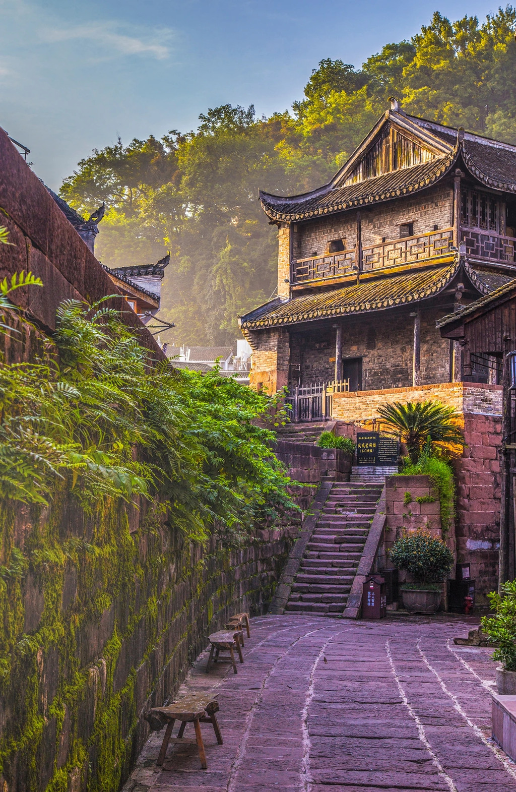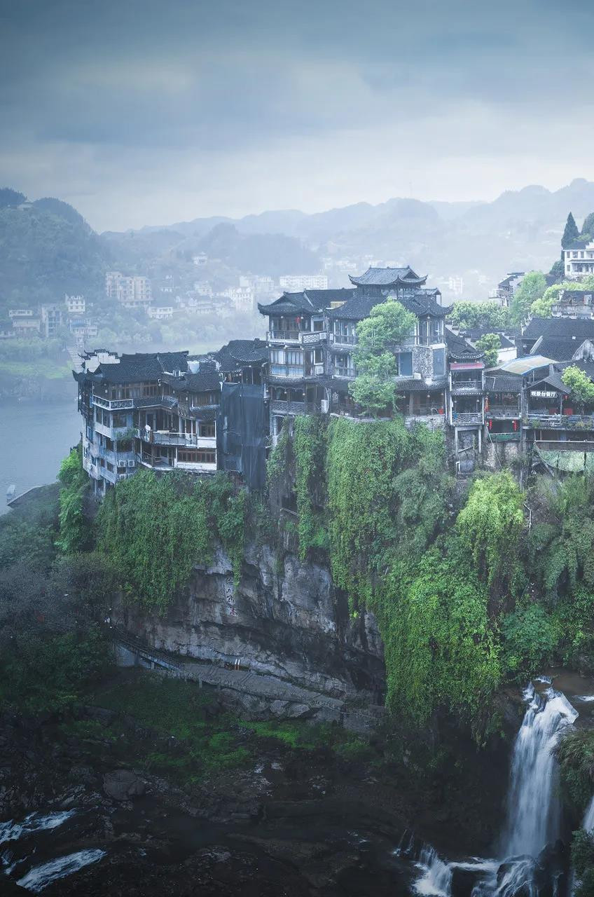 瀑布旁的“土王行宫”更是芙蓉镇的一大亮点。这里是当年富甲一方的土王所选择建造避暑山庄的地方,一夫当关,万夫莫开。行宫侧面是悬崖峭壁,宫前溪水长流,飞瀑直泻,震耳欲聋,气势蓬勃。在土司王统治时期,这里一直是士兵们的营房所在地。不过芙蓉镇的古板街和很多古镇不一样,有一条长长的类似长城的城墙,想必早年是为士兵们站岗放哨的,如今有很多小姑娘在这里拍照,灯影婆娑,看起来都是美人。