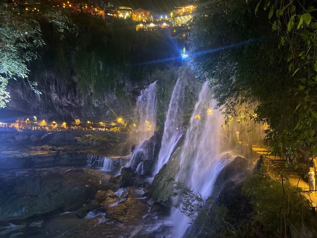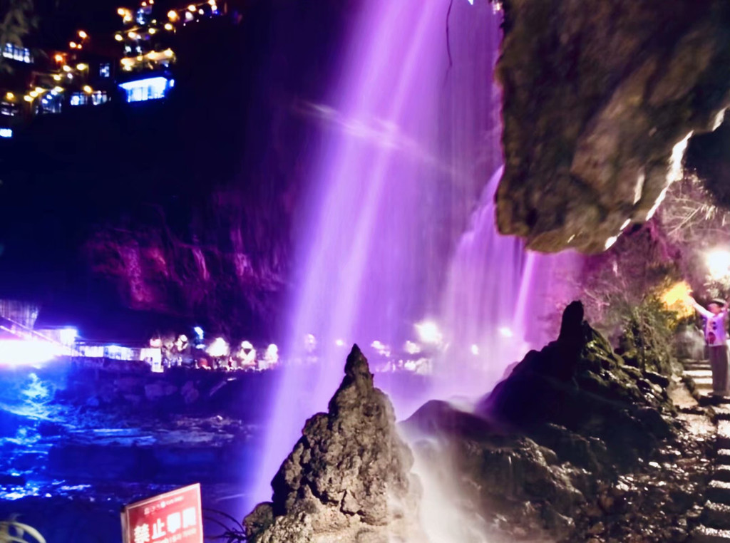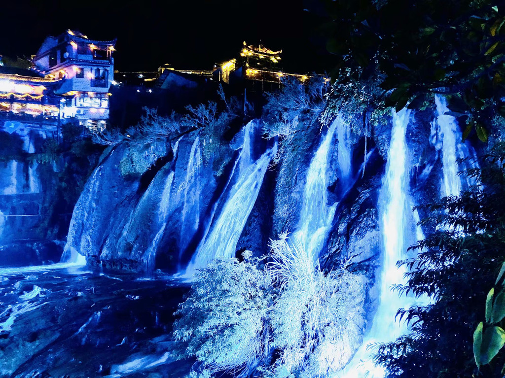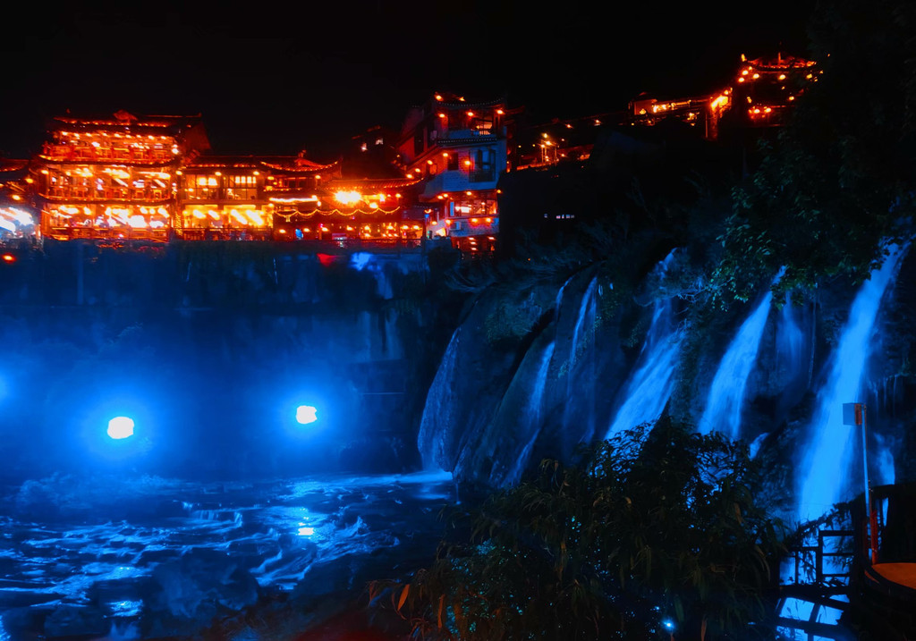 夜幕降临,从客栈出发,脚步拾级而上,如登云梯。来到高处,我们才发现,这座始于秦汉的古镇,其石板街依山傍水,曲折蜿蜒,古朴悠长。眼前的土家族吊脚楼高悬清崖之上,布局精巧,高低错落,淡雅灵秀,却可望而不得近之,令人叹为观止又惋惜连连。配合得更为恰到好处的是芙蓉镇的瀑布,奔涌如潮,声震如雷,似天风飘落,雾锁青山,烟迷古镇,宛如仙境。难怪,芙蓉镇又被成为“挂在瀑布上的千年古镇”。