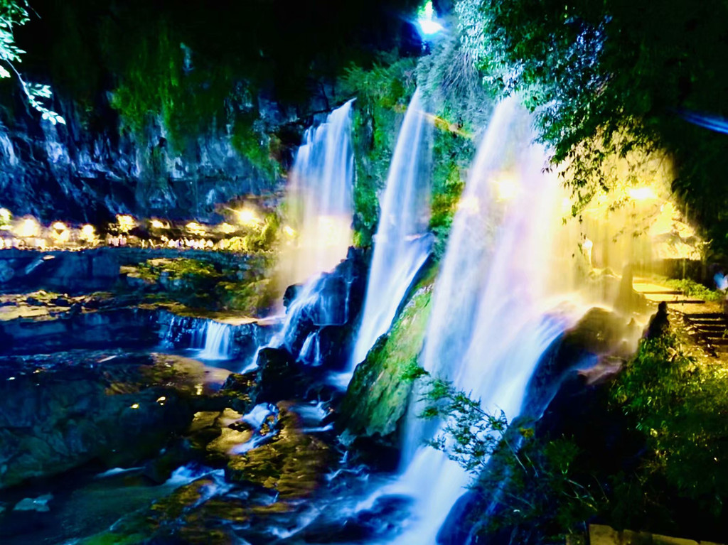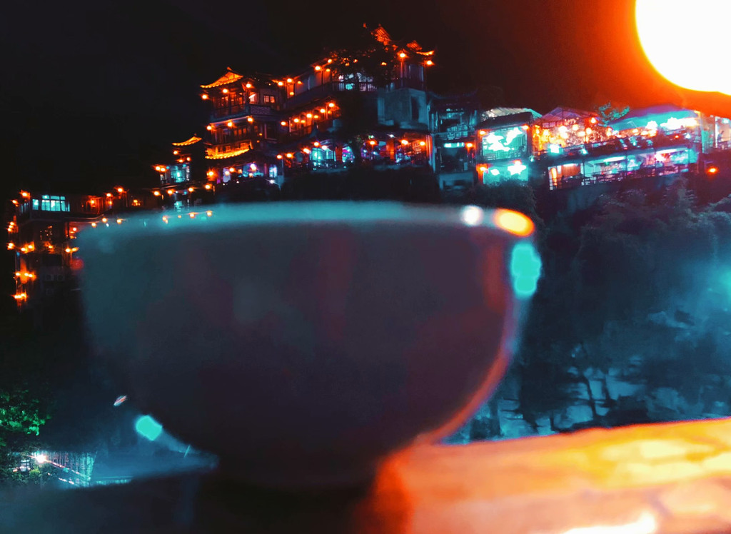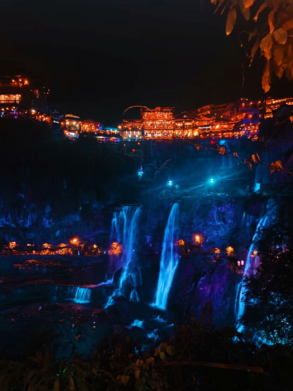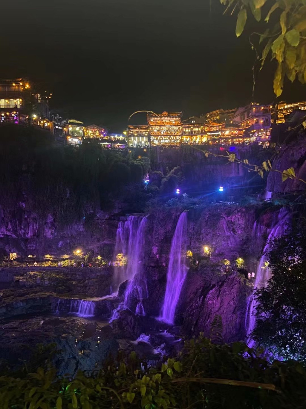 夜幕降临,从客栈出发,脚步拾级而上,如登云梯。来到高处,我们才发现,这座始于秦汉的古镇,其石板街依山傍水,曲折蜿蜒,古朴悠长。眼前的土家族吊脚楼高悬清崖之上,布局精巧,高低错落,淡雅灵秀,却可望而不得近之,令人叹为观止又惋惜连连。配合得更为恰到好处的是芙蓉镇的瀑布,奔涌如潮,声震如雷,似天风飘落,雾锁青山,烟迷古镇,宛如仙境。难怪,芙蓉镇又被成为“挂在瀑布上的千年古镇”。