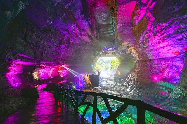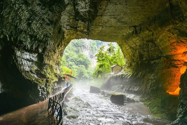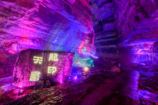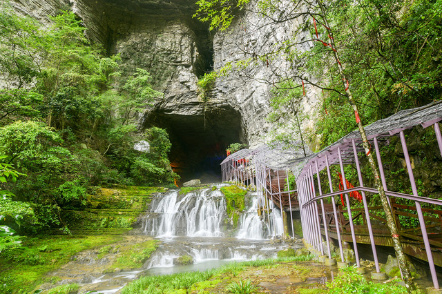 黄龙洞则是九路寨的又一招牌。洞深600余米,高30余米,宽10余米,洞中涌出的流水层层叠叠,在洞口形成一个六叠大瀑布,岩壁和洞口的树就像龙须,而洞口则俨然一张龙嘴。