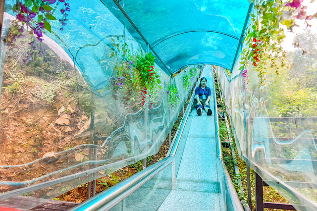 下山的时侯有新晋网红玻璃滑道可以体验。高强度高透明的玻璃,蜿蜒盘旋在山间丛林之中,360度回转造型,增加刺激感,一边赏景,一边体验一边让肾上腺素飙升。