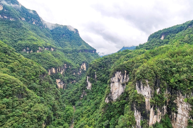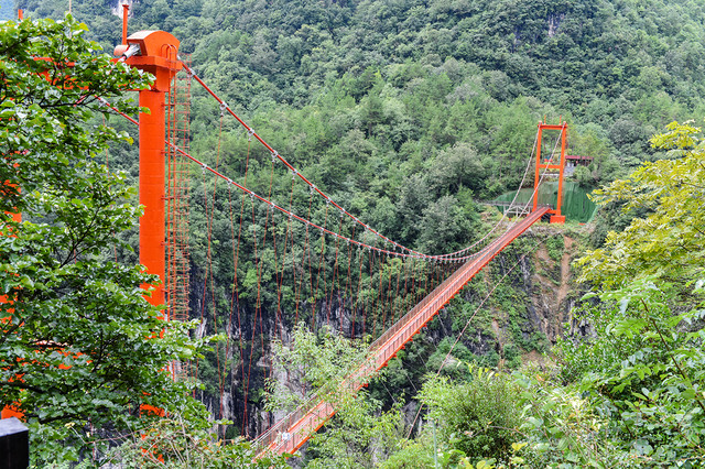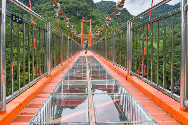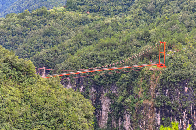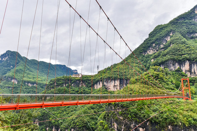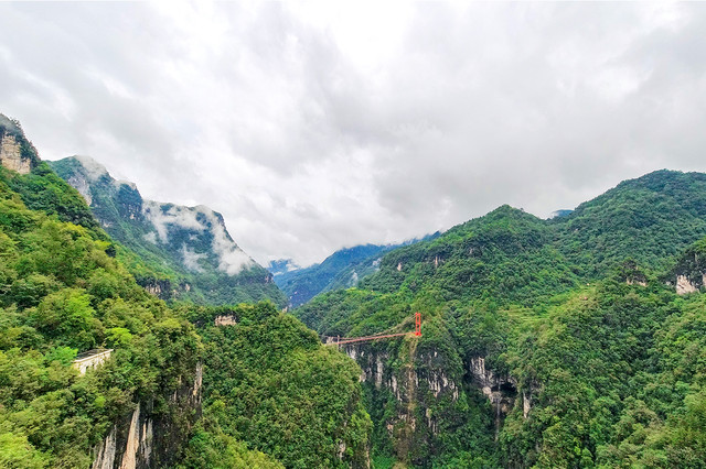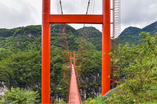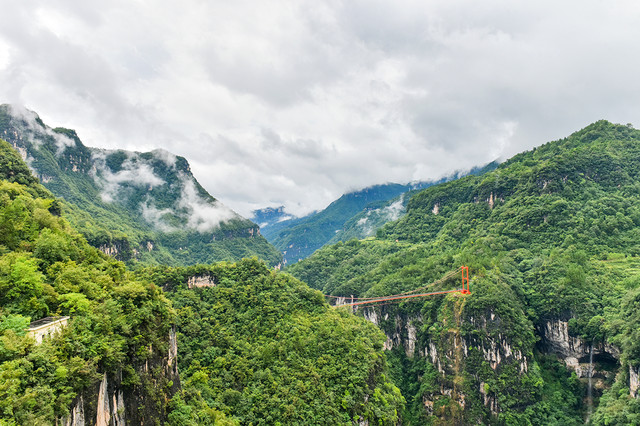 九路寨的峡谷间有一座著名的网红峡谷索桥。这座索桥长220米,高230米,中间有十多米桥面是透明玻璃组成。走在索桥上,耳边是呼啸的山风,身边桥体微微的晃动,远处是巍巍的山峰,头顶是绵延的云海,脚下是潺潺溪流,有点惊险,有点好看,亦有些心动。