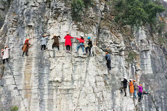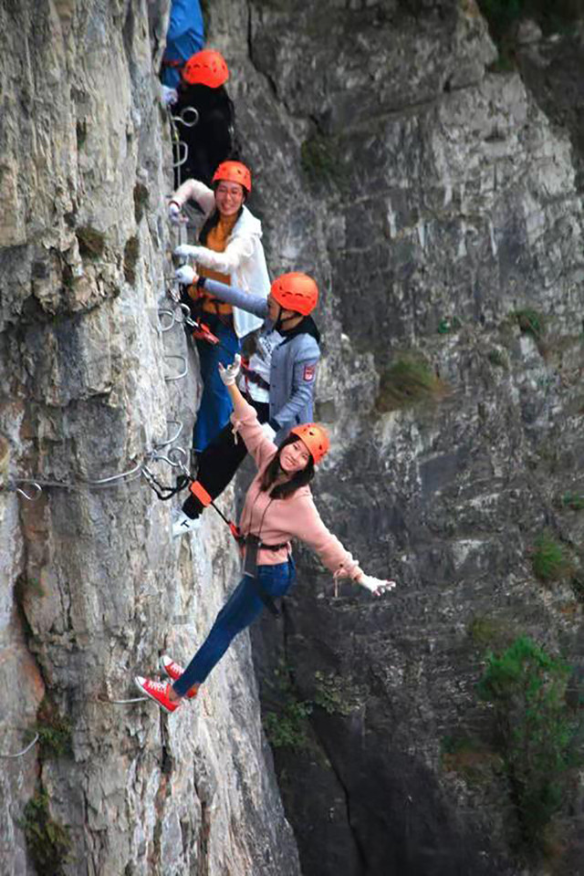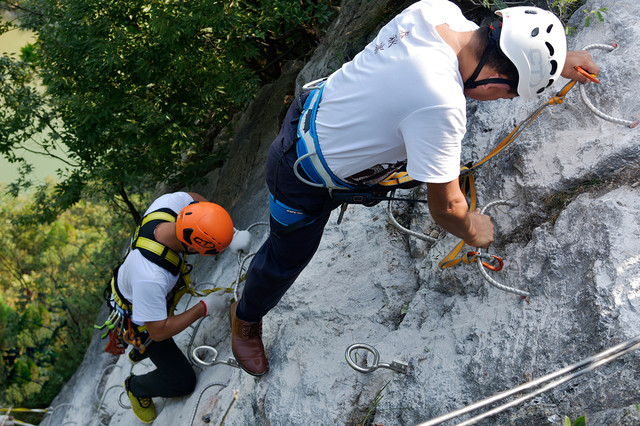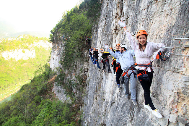 这是勇敢者的游戏,这一段飞拉达如果是有经验的攀崖者一般15分钟左右就能完成。如果从没玩过也不用担心,现场有充分的安全设备,还有安全员现在指导和演示,攀岩过程中可能会遇到的情况以及其处理方法,安全教练都会详细周到的给予现场教学,一般初学者也能在30-45分钟左右完成。