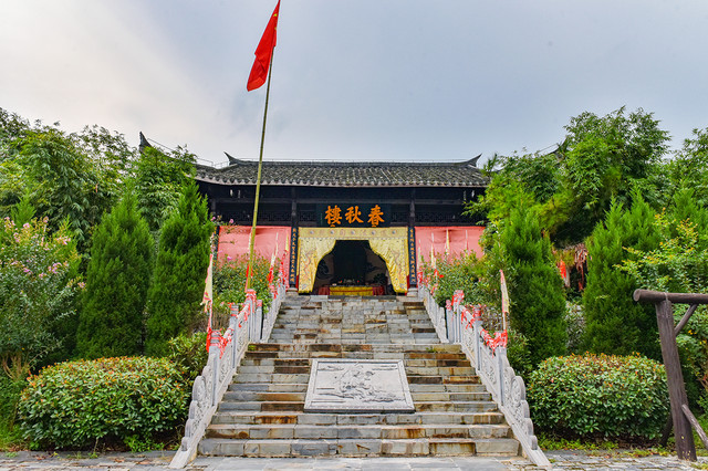 春秋楼是整个寨里最高的建筑,它位于狭窄的望月山山顶,寨楼的两边都是高达数百米的悬崖。相传二楼建成后,工人们看着旁边的悬崖都吓得不敢施工了,就在这个时侯,山间突然浓雾腾升,浓浓的云雾将整座山谷覆盖,工人们得以顺利施工,春秋楼如期建成。当地人认为,那些将悬崖遮罩的云雾是因为关公显灵护佑。为了纪念,如今楼前的山崖上还塑有中国最大的关公塑身。