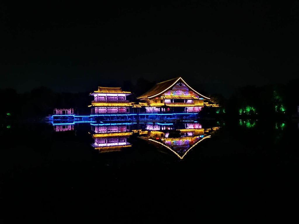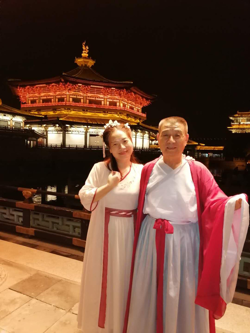 唐城是襄阳最近几年才修好的影视城,拍过《妖猫传》,两年以前就来玩过,很喜欢,这次特地带爸妈来打卡,在城里吃饱以后,坐个公交可以直到唐城影视城下,提前来到唐城门口配套的商业街——化妆。周边有一些租衣服的小店,推荐吊桥旁边的古衣坊,老板人很爽快,租衣服+头饰60元/人,我自己的汉服,单独盘发30元,化妆可以自己动手,我花了20元给妈妈化的妆也并没有贴花啥的,也是普通妆。汉服和头饰一定要有啊,会增加很多的乐趣。穿上汉服照相其实还是白天的效果会更好一些,唐城的美又必须在夜里才能领略,所以下午17点夜场开始就入场,性价比是最高的。先拍一组美美的照片,然后再开始玩。