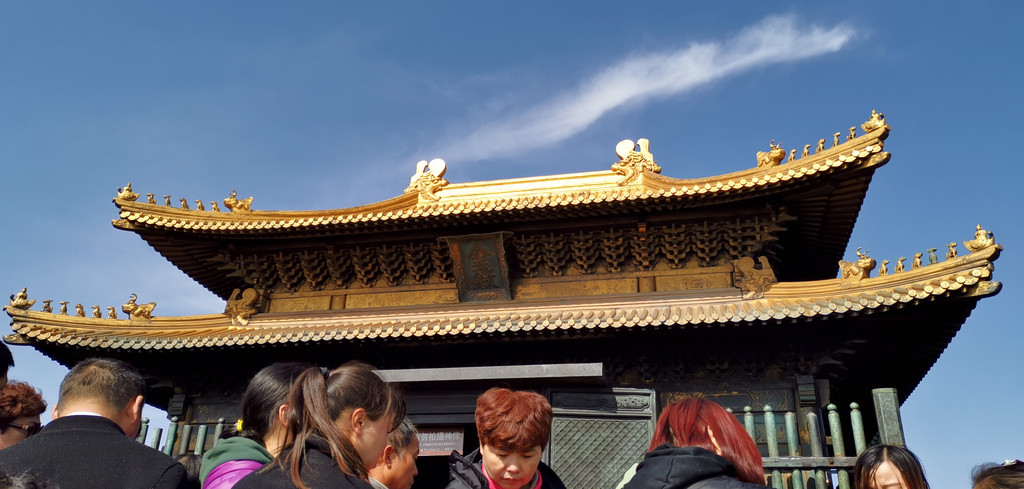 武当山金殿位于湖北省武当山天柱峰顶端,海拔1612米,面积约160平方米,始建于明永乐十四年(1416年),是中国现存最大、等级最高的铜铸鎏金大殿。 金殿坐西朝东,面阔三间5.8米,进深三间4.2米,高5.54米,为仿木结构鎏金铜殿,重檐庑殿顶。殿身为铜铸隔扇,隔扇上铸出大、小额枋,上檐作重翘重昂九踩斗栱,承托檐椽。下檐施单翘重昂七踩鎏金斗栱,檐际悬铜铸鎏金竖匾,镌“金殿”二字。金殿全部构件均采用分体铸造,经过榫卯安装,然后通体鎏金,结构严谨,连接紧密,无铸凿之痕。殿内供真武祖师像,左有金童捧册,右有玉女执印,水火二将擎旗拔剑。后壁悬清康熙帝楷书“金光妙相”金匾。殿内栋梁和藻井都有精细的花纹图案。藻井上悬挂一颗鎏金明珠,人称“避风仙珠”。传说这颗宝珠能镇住山风,不能吹进殿门,以保证殿内神灯长明不灭。其实山风吹不进是因为殿壁及殿门的各个铸件,非常严密、精确。金殿内有“真武”铜像,重达10吨。