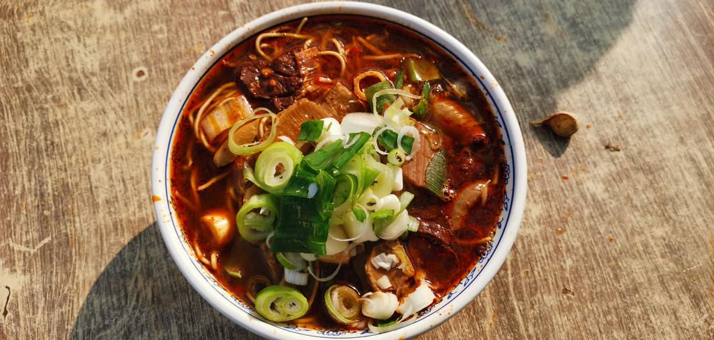襄阳的牛油面比南方的伊面要劲道,比西北的拉面要圆润,与武汉的碱水面同根同源,浸在红滋滋的牛油中吃得人红光满面。牛肉分量极多,而且是上等的好牛肉,切成大块的薄片,烧制得醇香浓郁,吃起来很软糯,还不掐牙齿。
