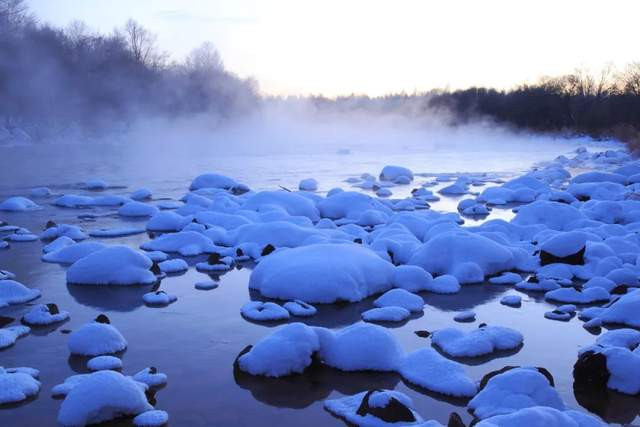 不冻河也是冬天的一大奇景,冰天雪地中流淌着一条雾气朦胧的河,怎么看怎么梦幻、怎么看怎么诗意。