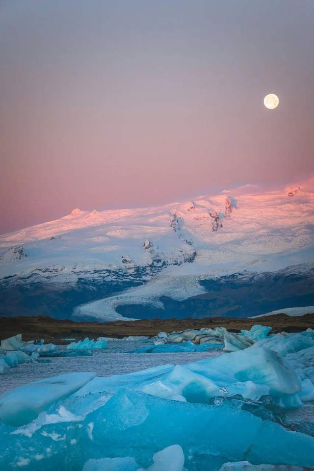 不过小编最喜欢的是日出时的蓝冰,粉色与蓝色的交织,在月光的清冷中,梦幻而美丽。