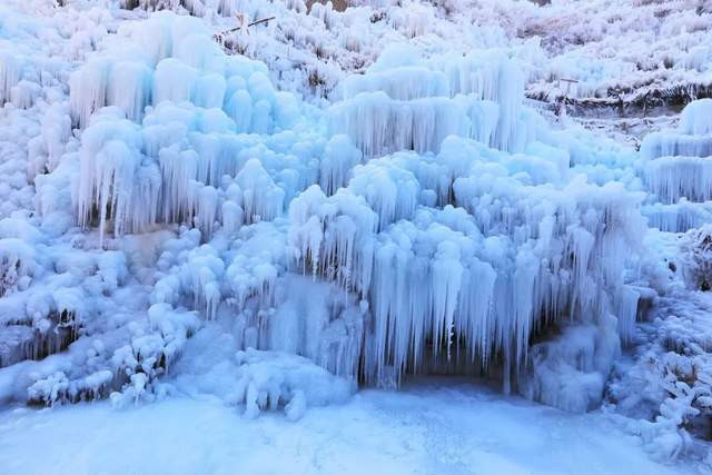 由上而下、由粗变细的冰瀑布,虽然已经被冻住,但栩栩如生的形态,仿佛下一秒便能落下来。