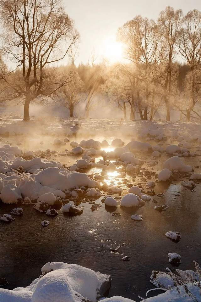 冷雾在平静的水面上轻柔弥漫,两岸是早已银装素裹的树木、花草、石头...