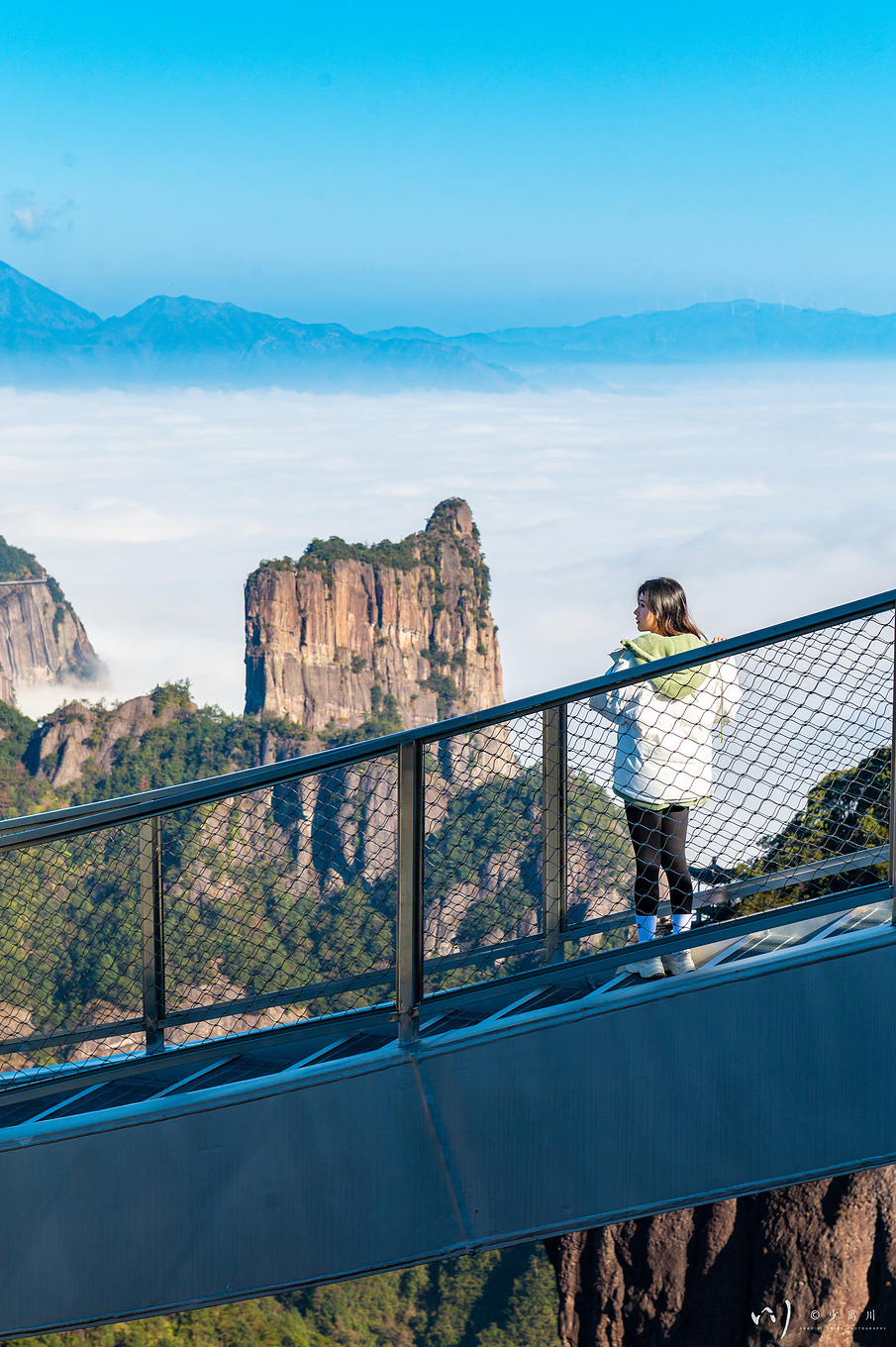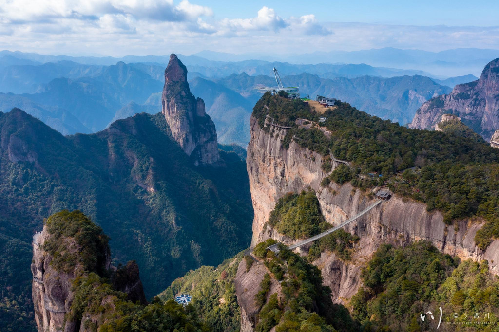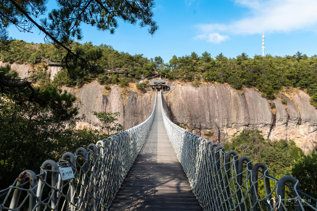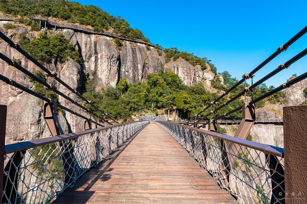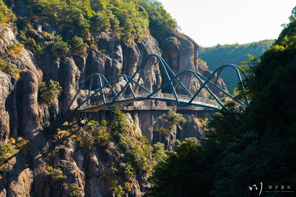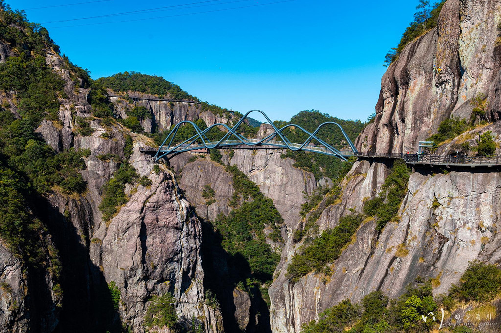 下索道爬一个小坡就到了第一站——如意桥,刚柔并济的造型与神仙居的自然风光完美地融为一体,宛如一柄空中的玉如意,又似仙女的披帛,是欣赏“一帆风顺”绝佳位置。