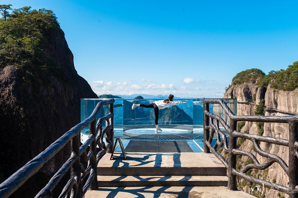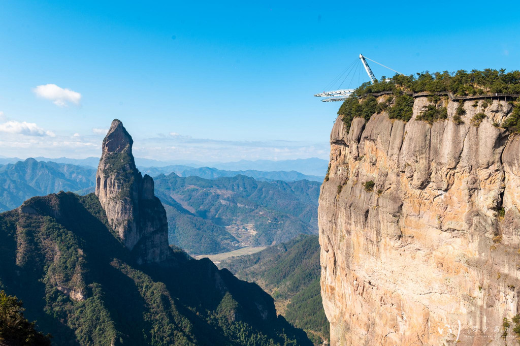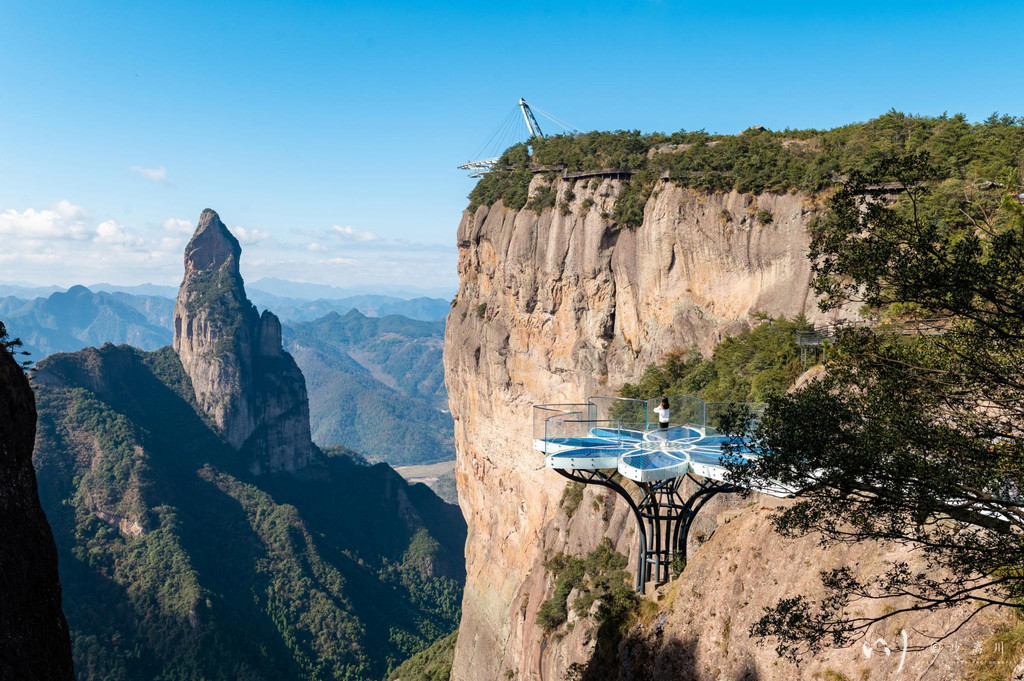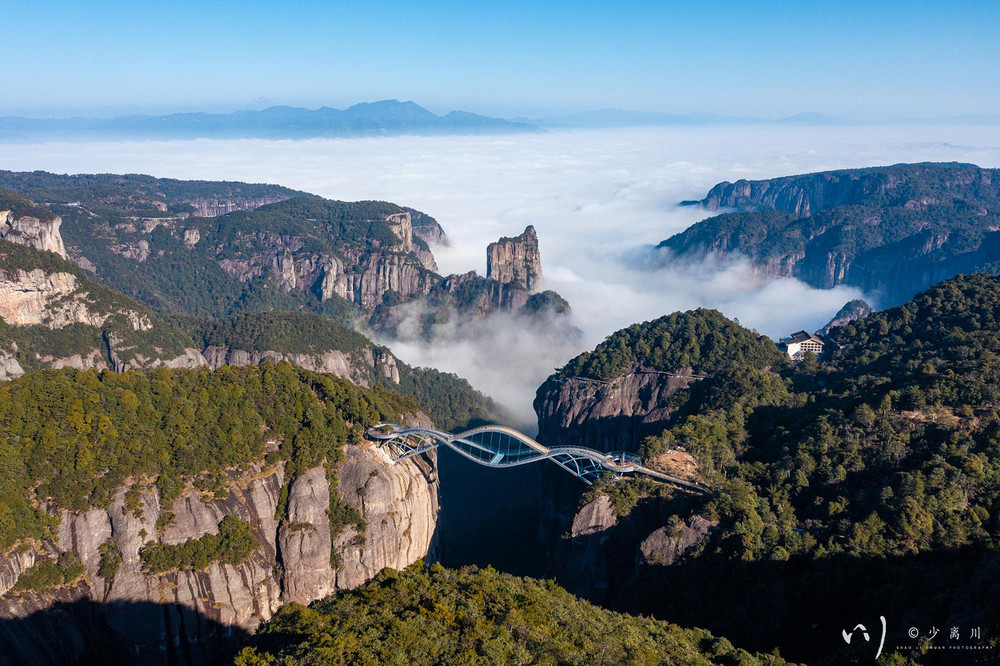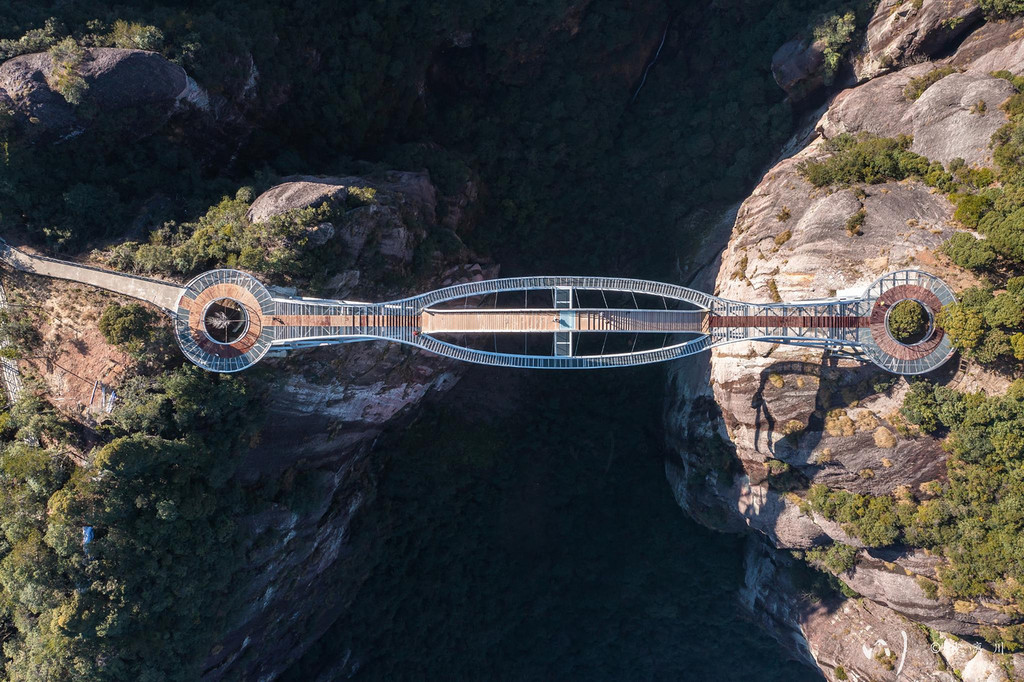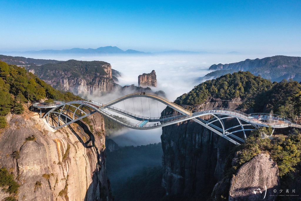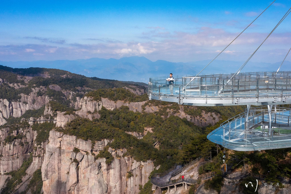 桥身跨越悬崖峭壁,将两座植被茂密的山连接在一起,立于其上,便能以一个开阔的视野纵览神仙居的秀丽山色,此外,为了“吓一吓”游人,如意桥的桥面部分由玻璃制成,提供了一种沉浸式的观景体验,给人带来视觉冲击、沉浸体验的同时,也提供了高空冒险的惊险刺激感。