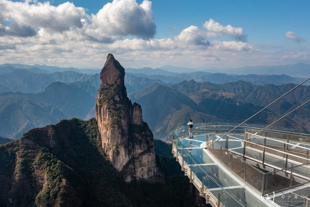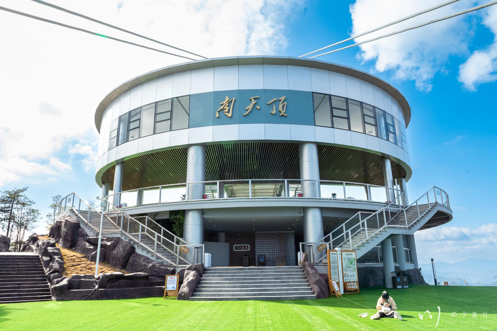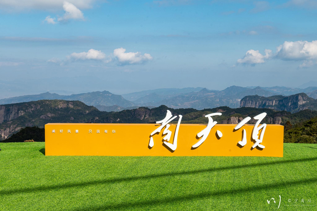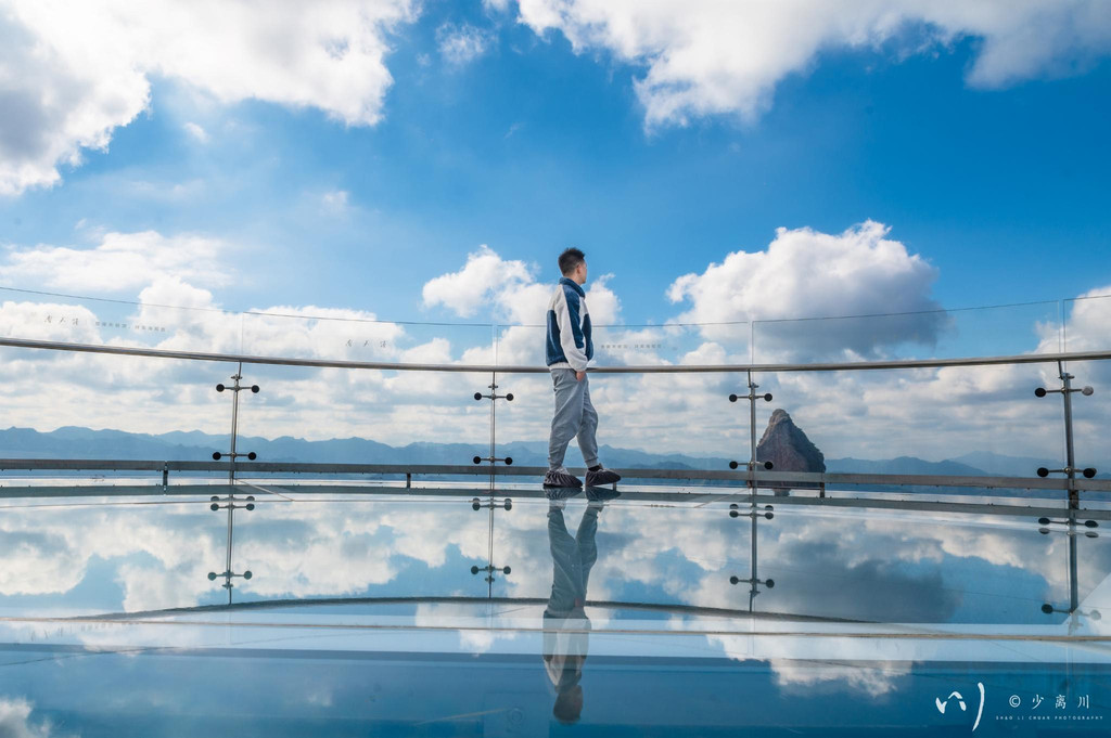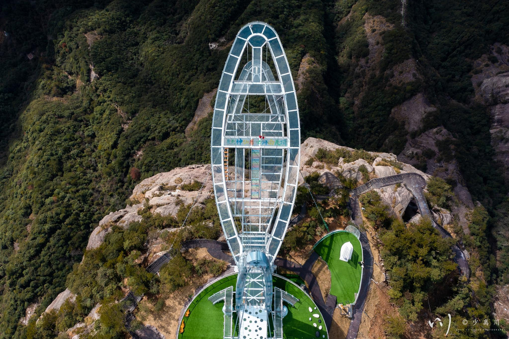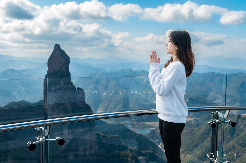 南天顶是景区的制高点,也是离观音峰最近的观景台,在海拔869米的高空中,一座塔高30米,悬高400米,悬挑面积1000余平方米的玻璃观景台嵌于峭壁之上。