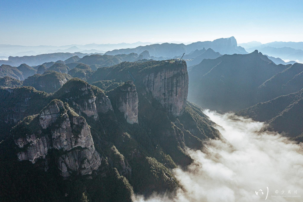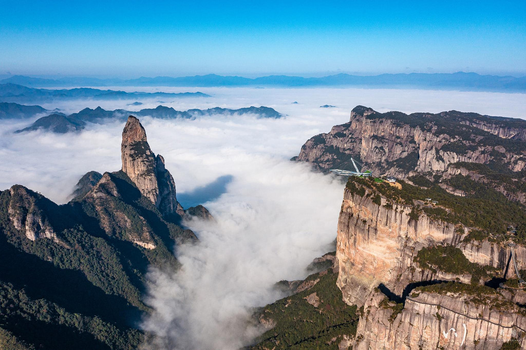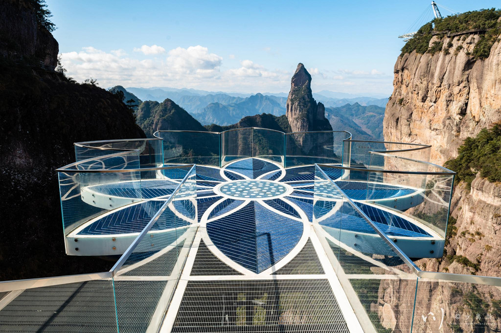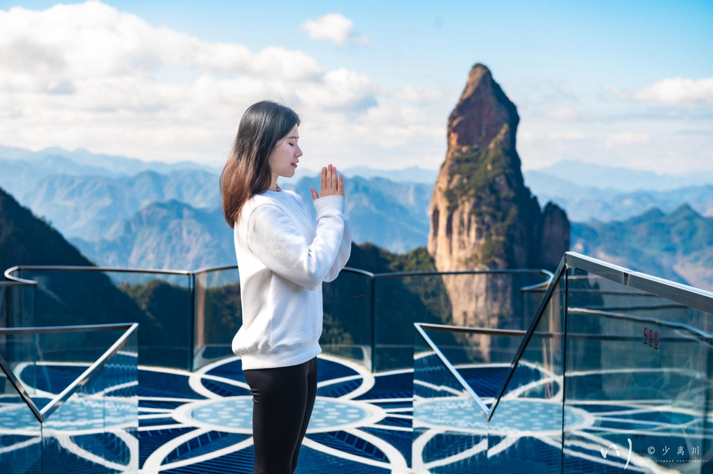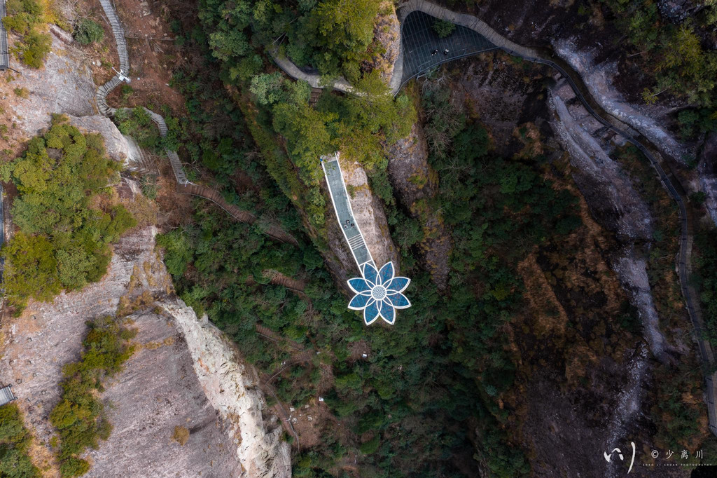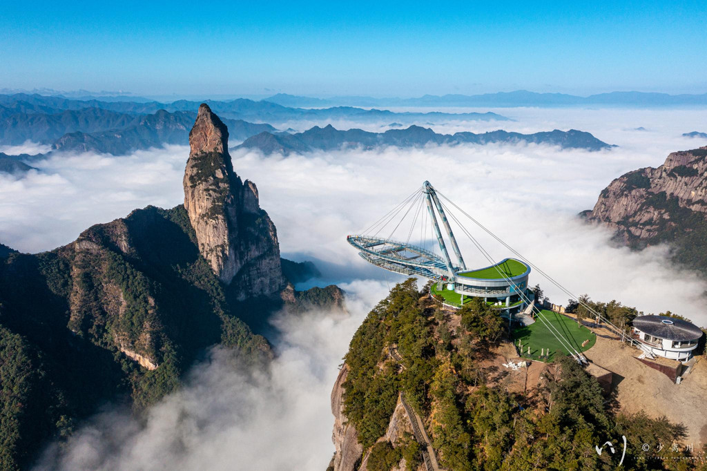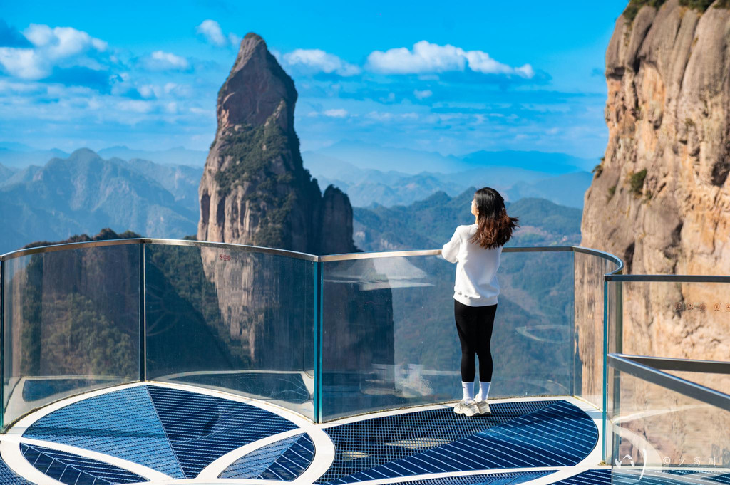 南天顶是景区的制高点,也是离观音峰最近的观景台,在海拔869米的高空中,一座塔高30米,悬高400米,悬挑面积1000余平方米的玻璃观景台嵌于峭壁之上。