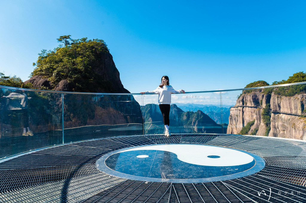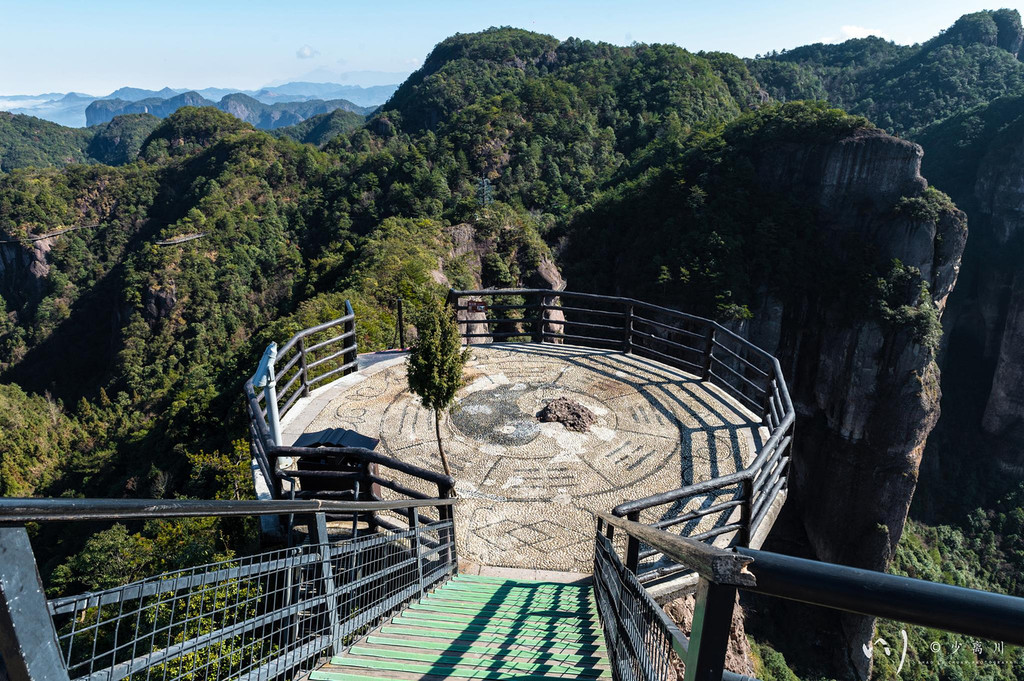 登顶就来到了太极八卦台,位于崇山峻岭间,是一个绝佳的观景地,可以远看到卧龙桥,上帝视角下还能看到神仙居的地貌。