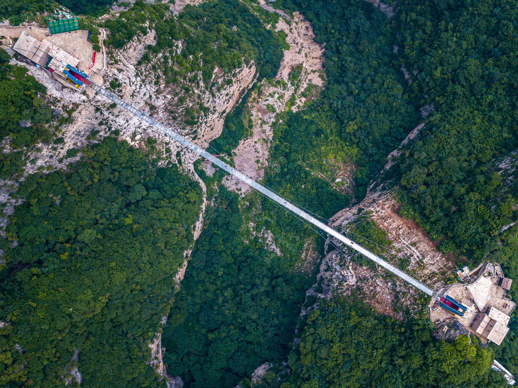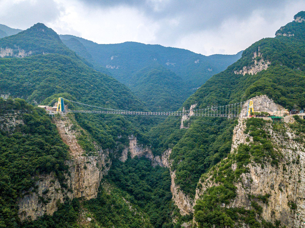 鸳鸯桥横亘在神塔和圣母洞之间,远远望去似飞龙从峡谷中飞起,四周环绕着连绵不绝的山涧,脚下是绝壁高空和奇山怪石,漫步在桥上惊险刺激,跳两下身边周围就发出阵阵尖叫。