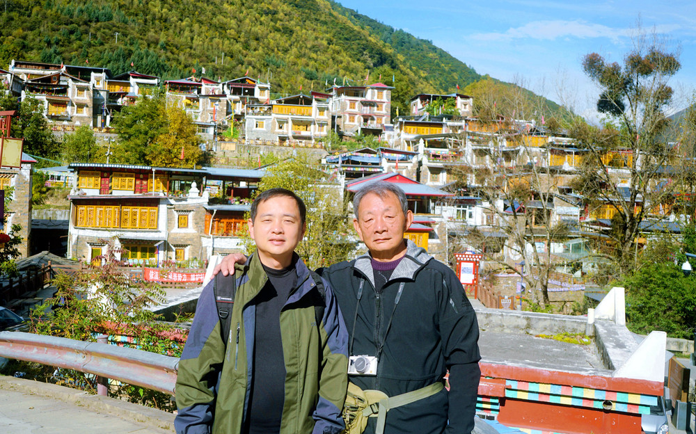 路边停车场收费10元/部,听收费员说,眼前的这一大片漂亮建筑是藏族村庄“西索村”,可以自由出入,不收费。两人进入村内,发现这里不仅是民居别致,而且家家户户种植大丽花,显得很有格调。路经一家小酒馆,藏族老板娘热情招呼我们入内坐坐,我要了杯甜茶,10元。小店内除老板娘外,还有两个小女孩,都是她的外孙女。老板娘说她一直想要个男孩,但却只生了两个女儿,每个女儿又都是只生了一个外孙女。我告诉她说,我是很想要个女孩,但却是只生了两个儿子,随后儿子又生出三个孙子,想男孩的总得女孩,想女孩的却又总得男孩。她听后大笑,声称这是菩萨的意思。土司官寨是在公路左侧的小山包上,我们登上小山,但没前往官寨,只是在山坡上支起三脚架,利用“西索村”为背景,采用自拍获得一张两人合影。