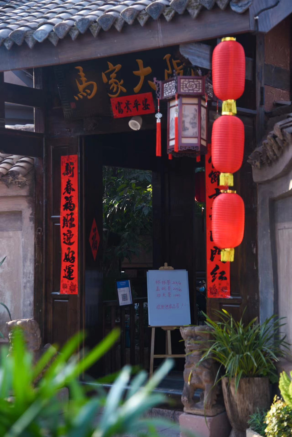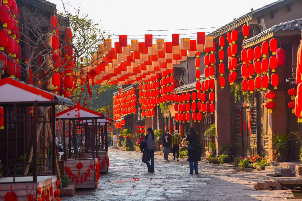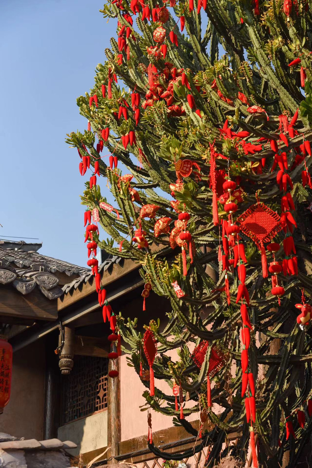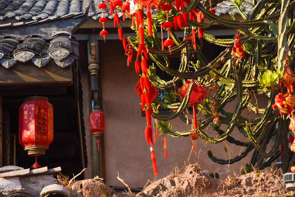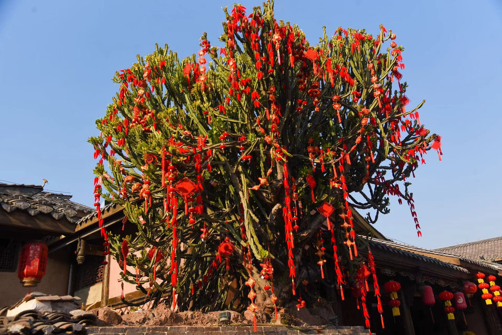 而在这古院落之中,还能看见建昌古城里另一个奇观,那就是上百年的巨型多肉“霸王鞭”。在很多人的印象里,多肉都是小小的一盆,这个霸王鞭却宛如参天大树一般,实属罕见,与周边的古建筑交相辉映,上面还挂满了红色的配饰,在这新春来临之际,也显得十分喜庆。