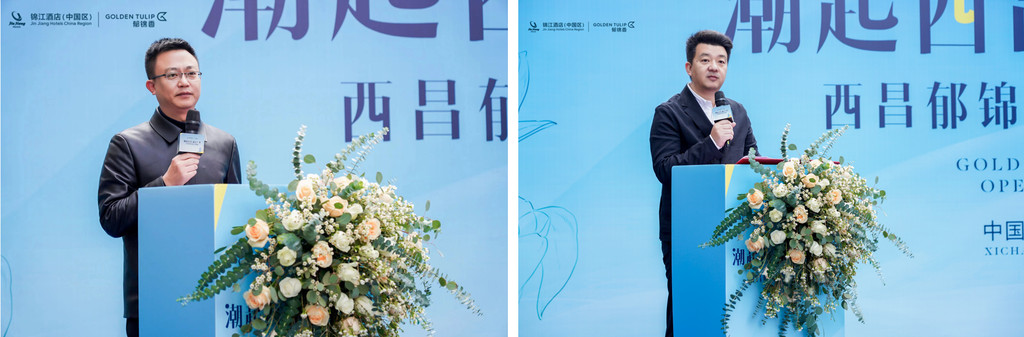 西昌市副市长石铭(左)及锦江酒店(中国区)副总裁、郁锦香-凯里亚德双品牌总裁肖波(右)在开业典礼上致辞