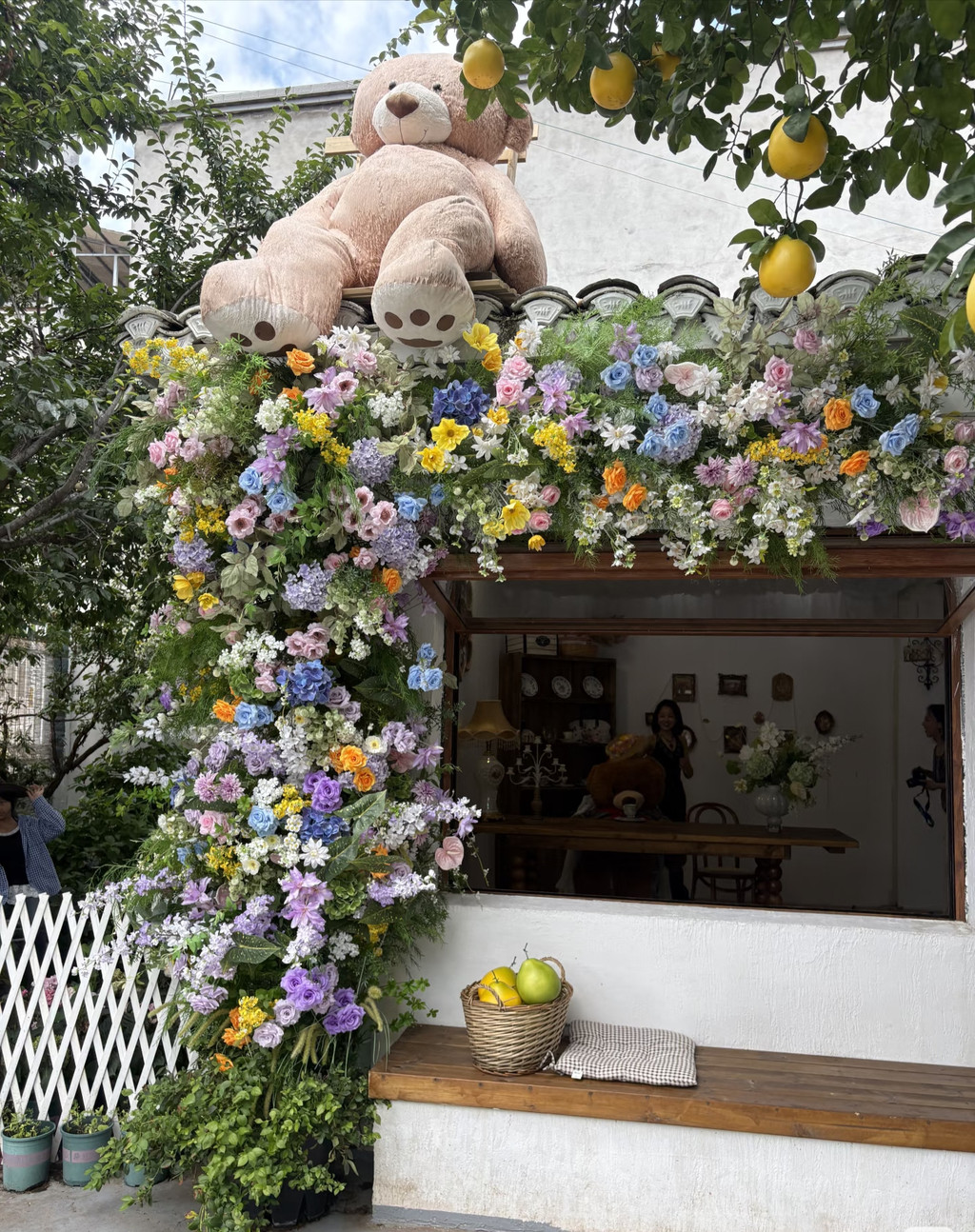 院里的小细节太戳人啦!墙角放着复古的自行车摆件,车筐里还插着假花;玻璃门上贴着可爱的卡通贴纸,阳光照进来,影子落在地上像小光斑在跳舞✨ 找个角落坐下,点一杯招牌的青柠气泡水,看着院外的老房子和偶尔经过的当地人,瞬间觉得时间都慢了下来,这种松弛感真的太爱了😌