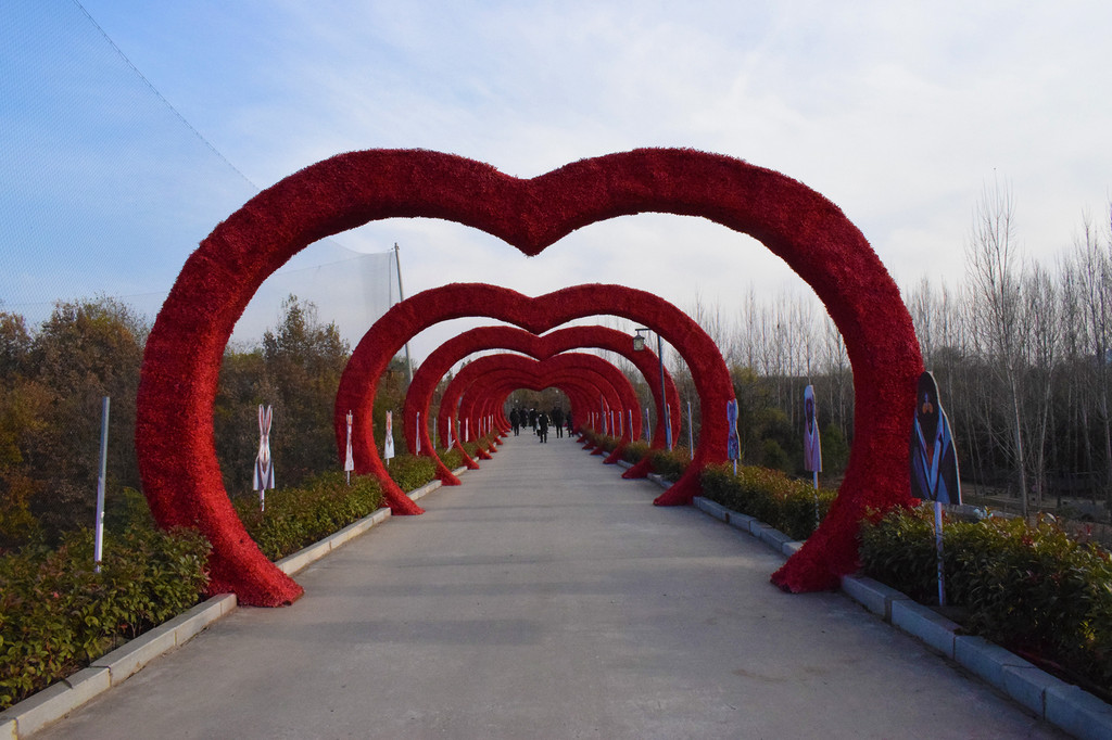 进入景区后走过悬挂着红旗的长廊,就会见到一条架设着空心的道路,眼前的景象让我想到了结婚时的爱情长廊,如果是情侣在这里拍照打卡一定是不错的选择。