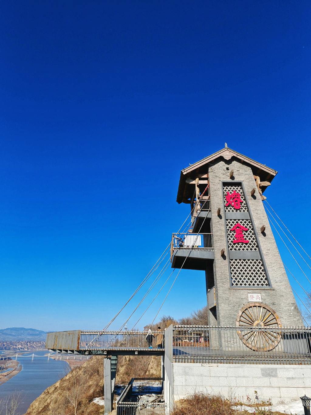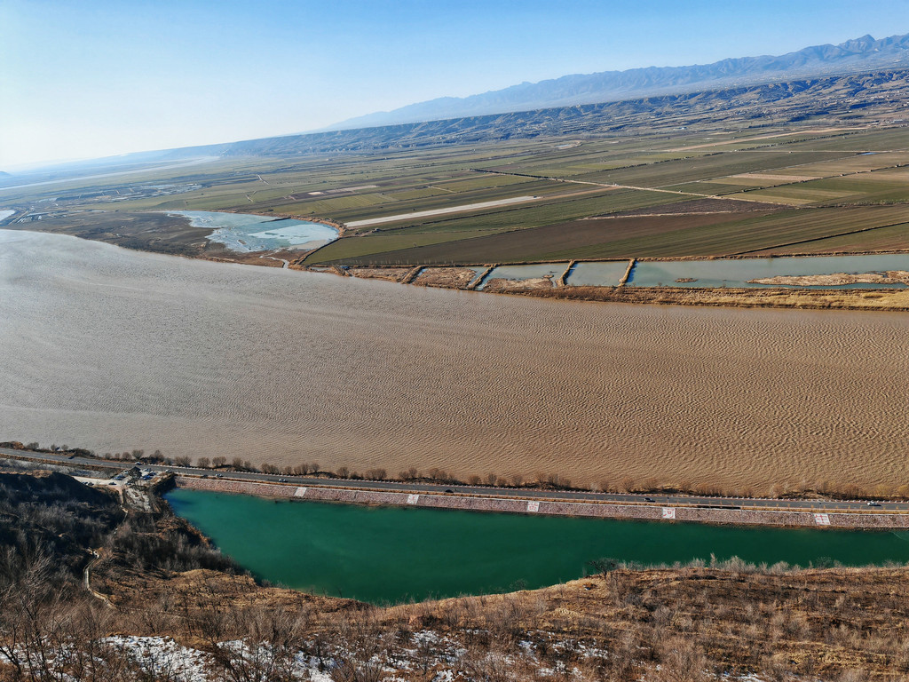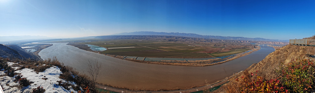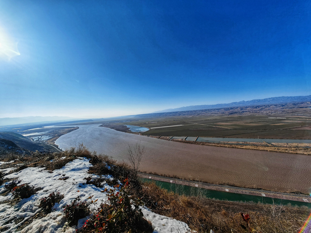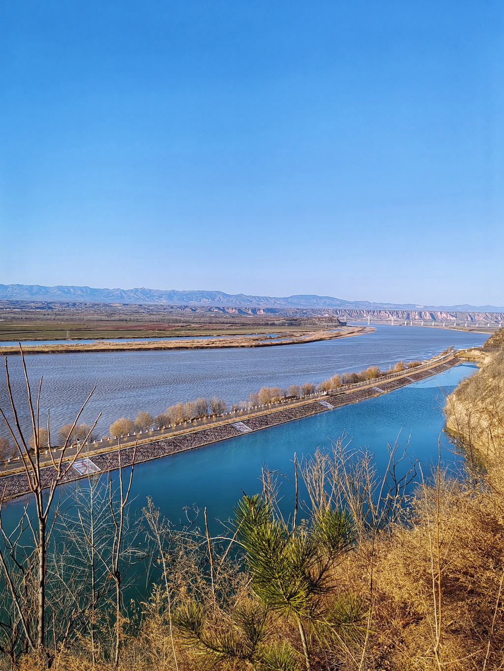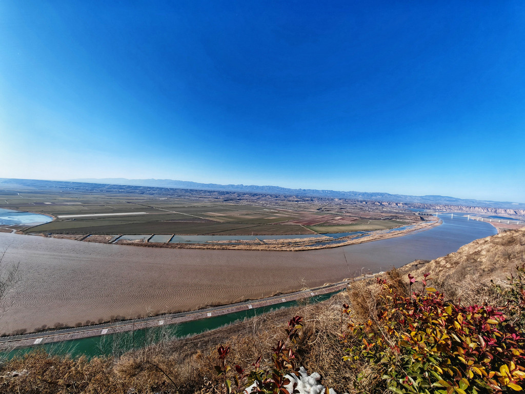 登上观景台,远望九曲黄河,宽阔的河流与山、田、湖、草相映俯瞰,沿黄生态廊道将黄河从中间隔开,悬崖一侧呈月牙形。静水区域因泥沙下沉水面呈青绿色,与黄河的青黄色呈现出强烈反差