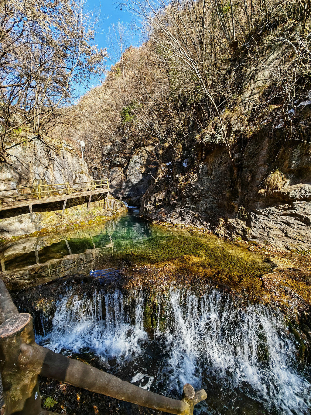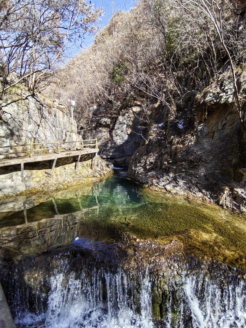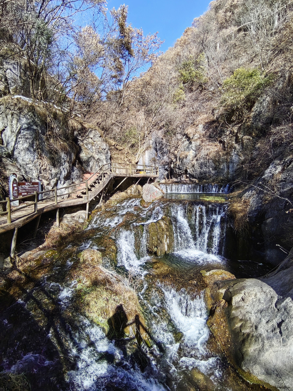 卧听瀑布隆隆,再看细水潺潺,仰望天空,天色碧蓝,四周绿意漫山