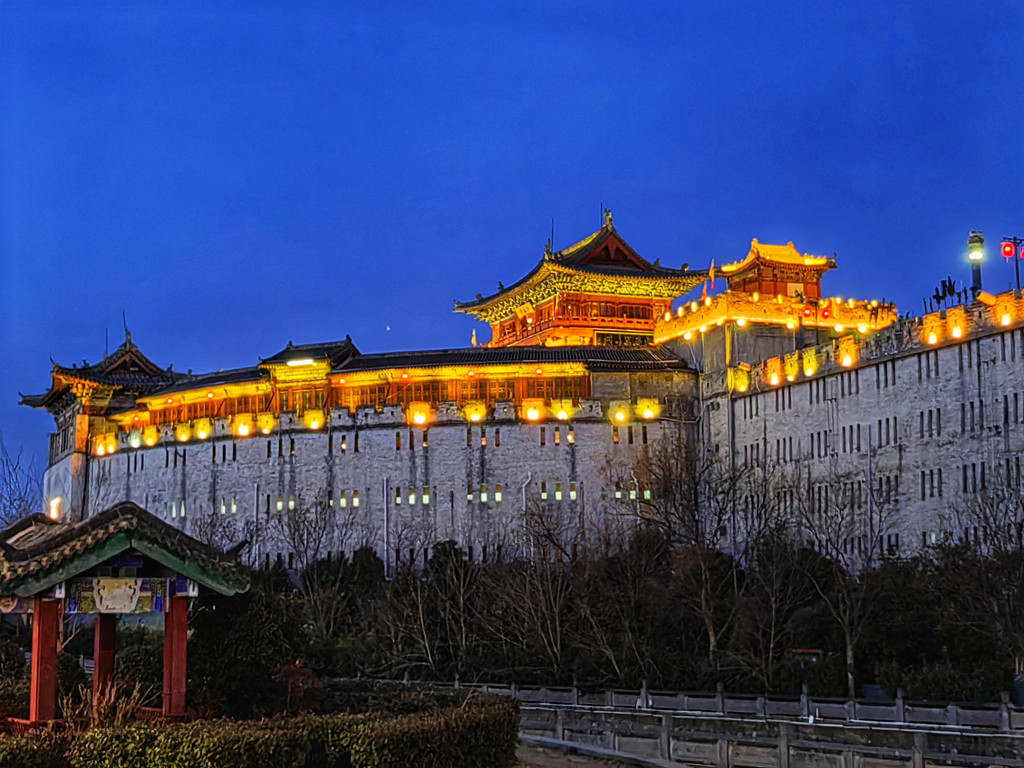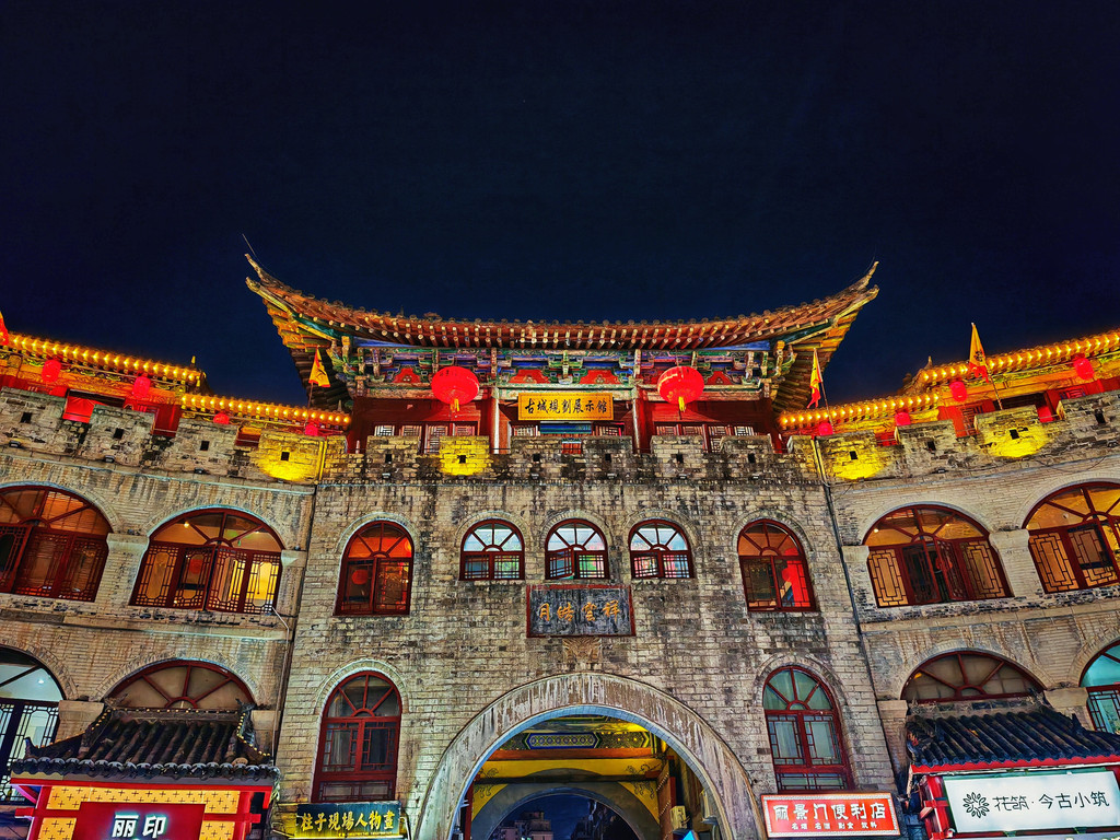 入往:洛阳乐思园商务酒店(洛邑古城丽景门十字街店),对面就是丽景门,夜晚的灯光尤其闪亮