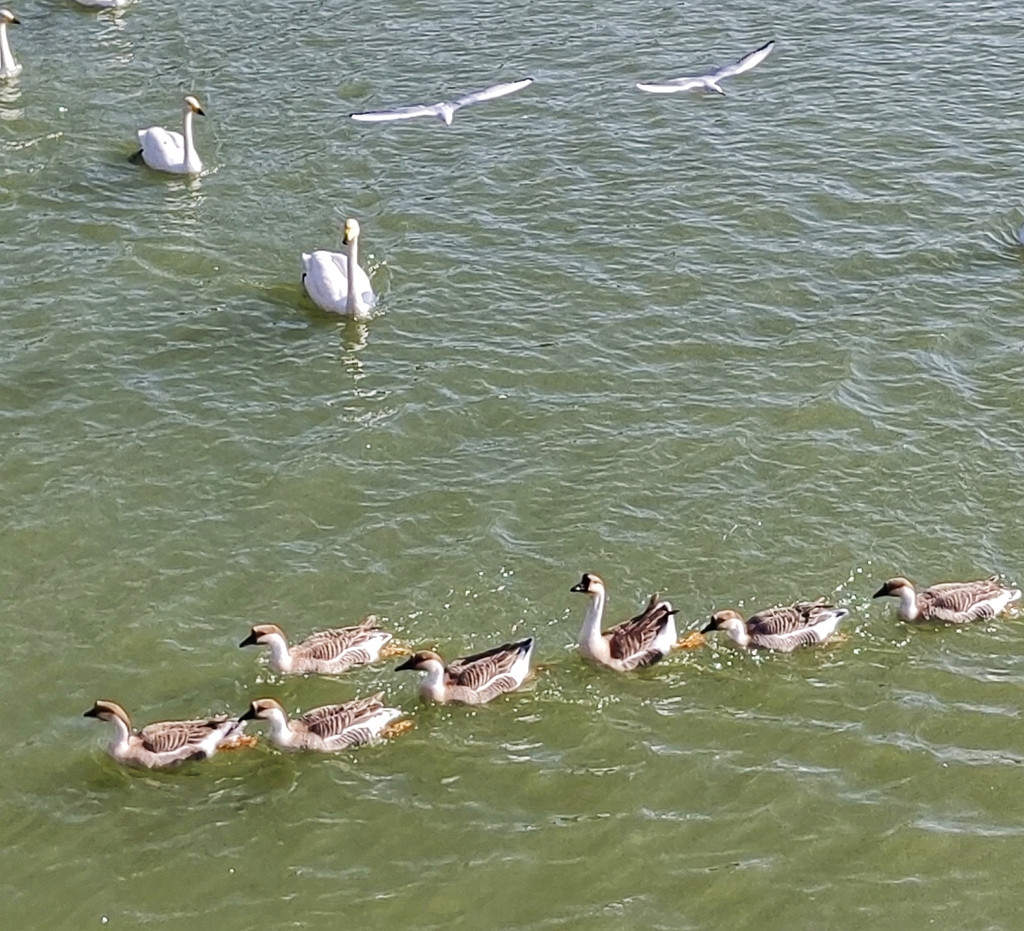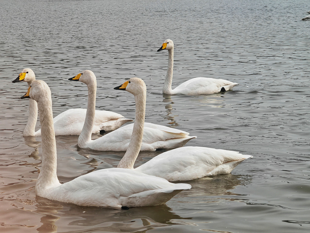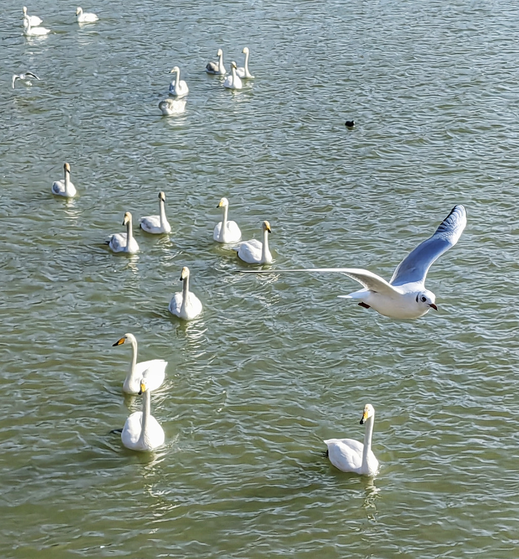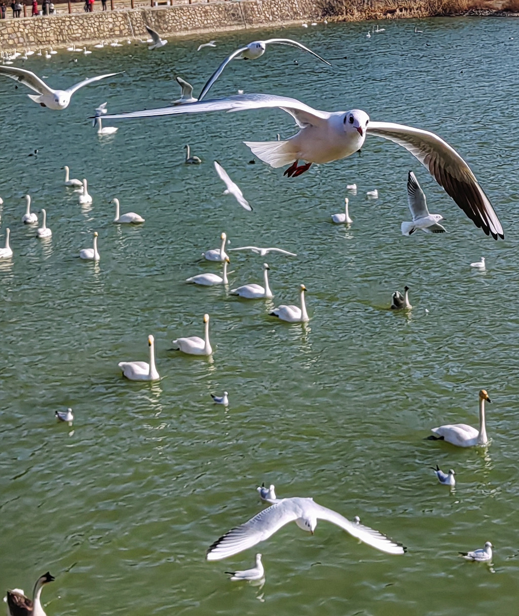 天鹅湖的宁静时光,在广阔明澈、碧波荡漾的湖面上,成群结队的天鹅自由飞翔、飘游、嬉水、觅食……这些来自远方的白色天使,千姿百态,构成一幅幅动人的画面