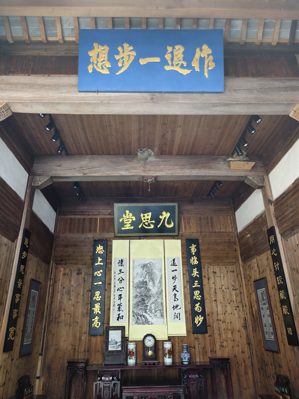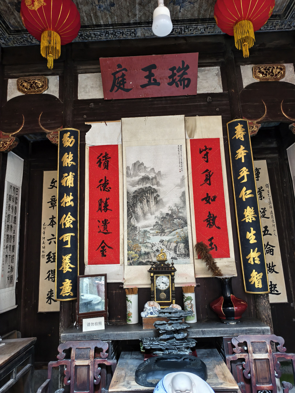 天井为四水归堂布局,天井四周的雀替上描金雕刻有四季花鸟图。最著名的是厅堂上柱子上悬挂的楹联:“快乐每从辛苦得,便宜多自吃亏来”,道出了徽商成功的经商之道和处世信条。