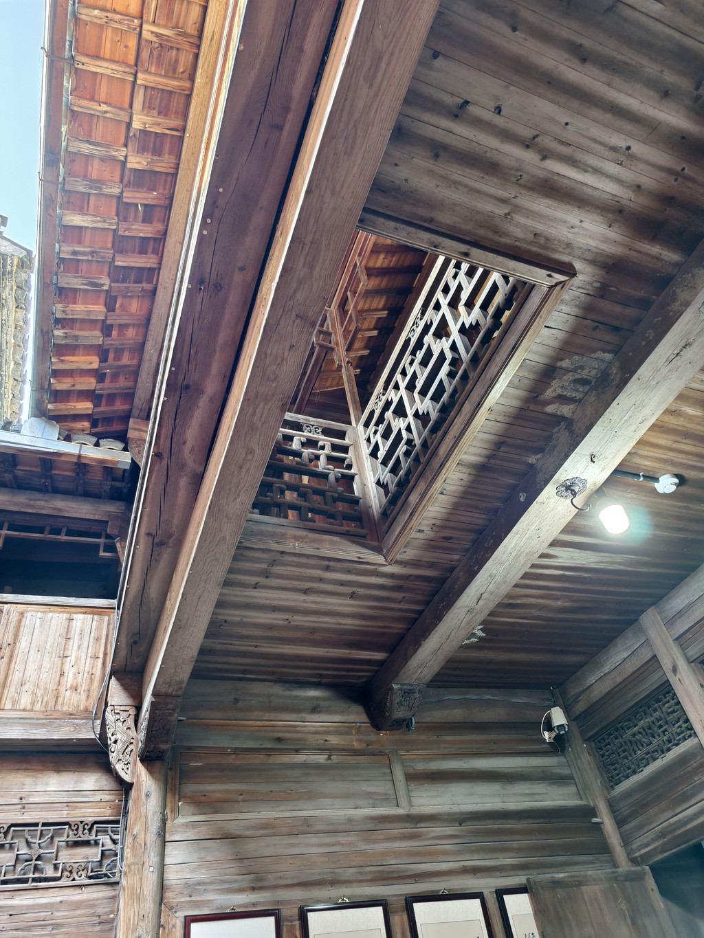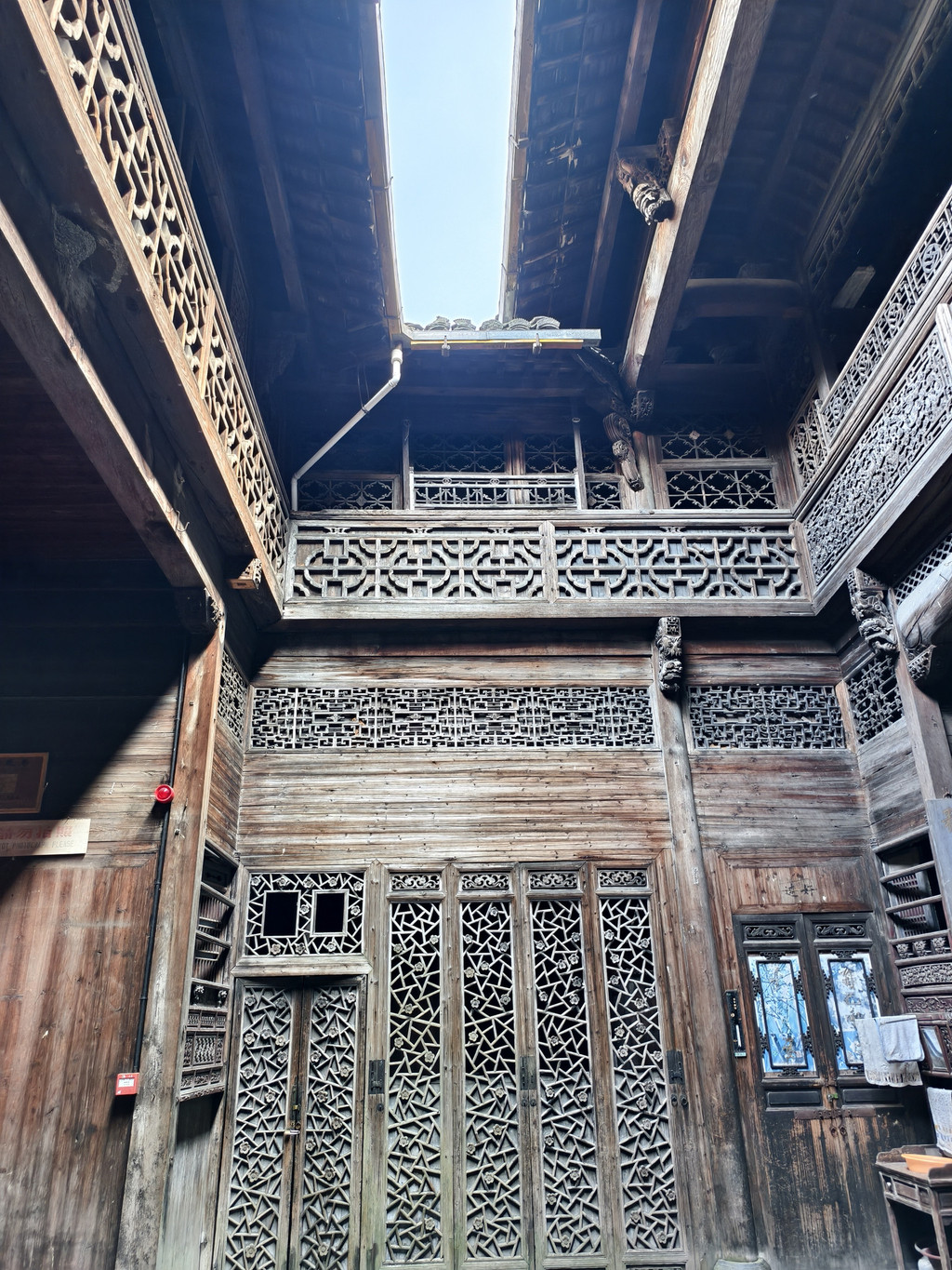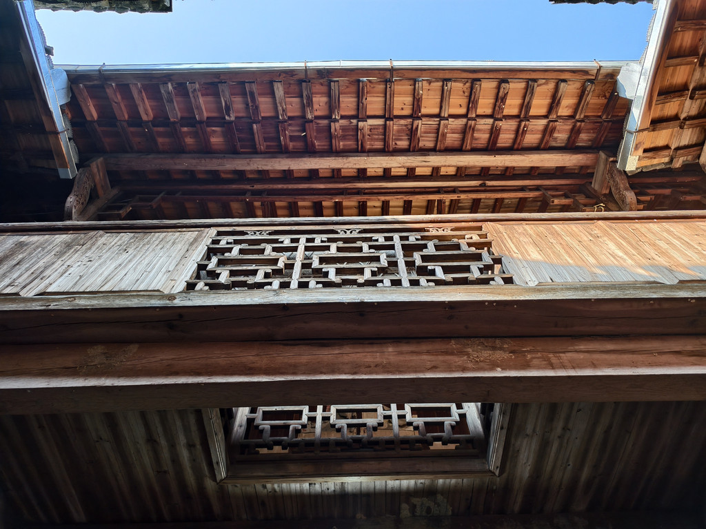 进入旷古斋,主体结构为三间二楼,进门为一石板天井,两厢有花饰隔扇,制作精细,极具美感。