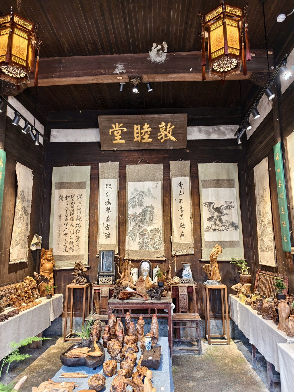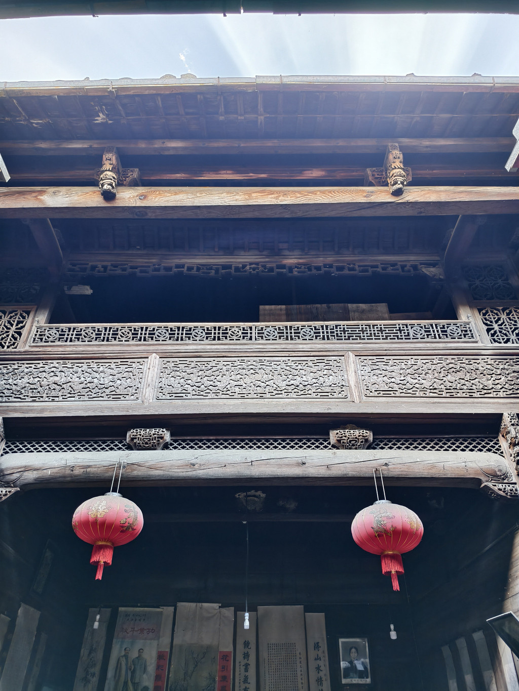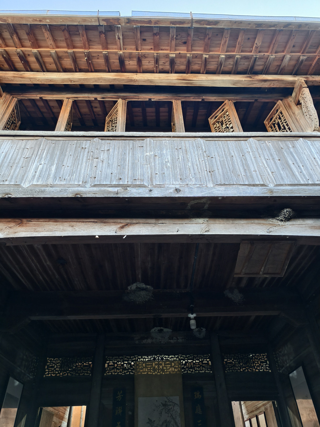 进入旷古斋,主体结构为三间二楼,进门为一石板天井,两厢有花饰隔扇,制作精细,极具美感。