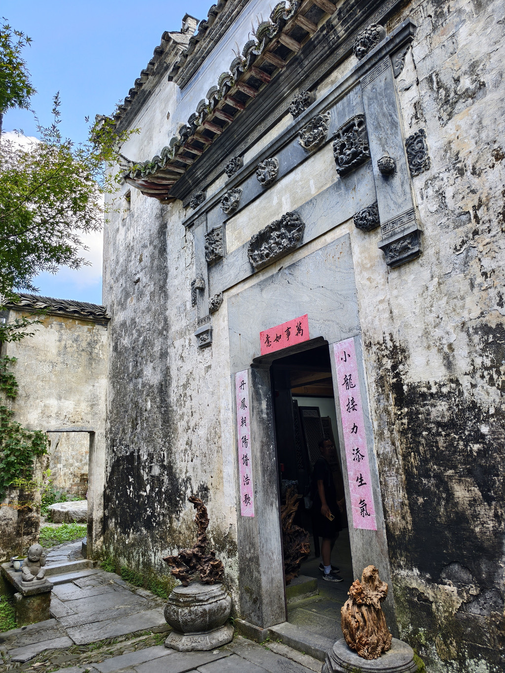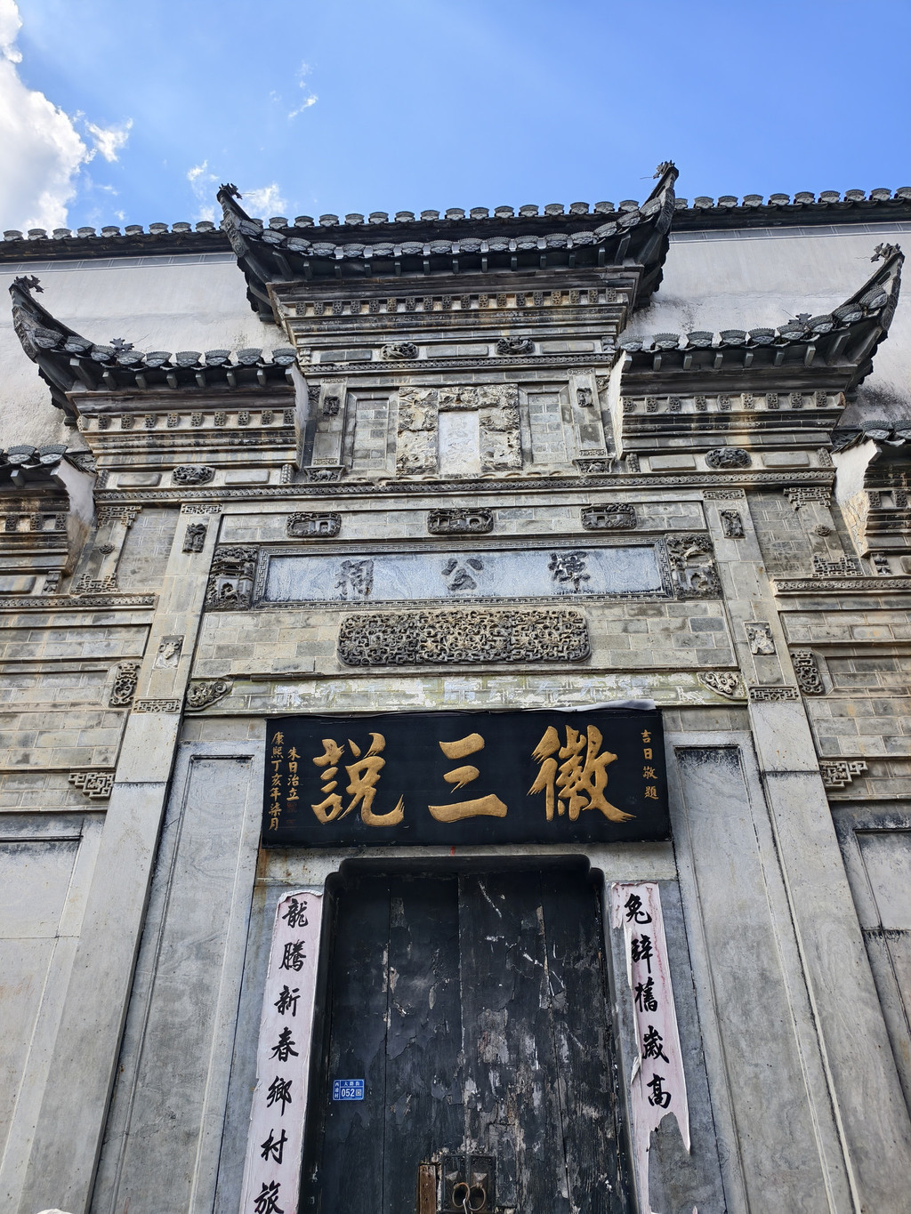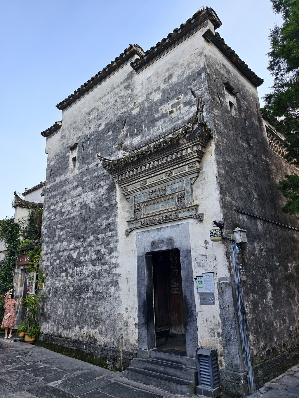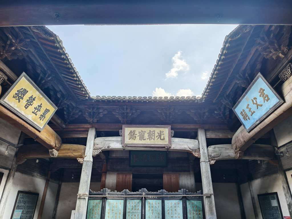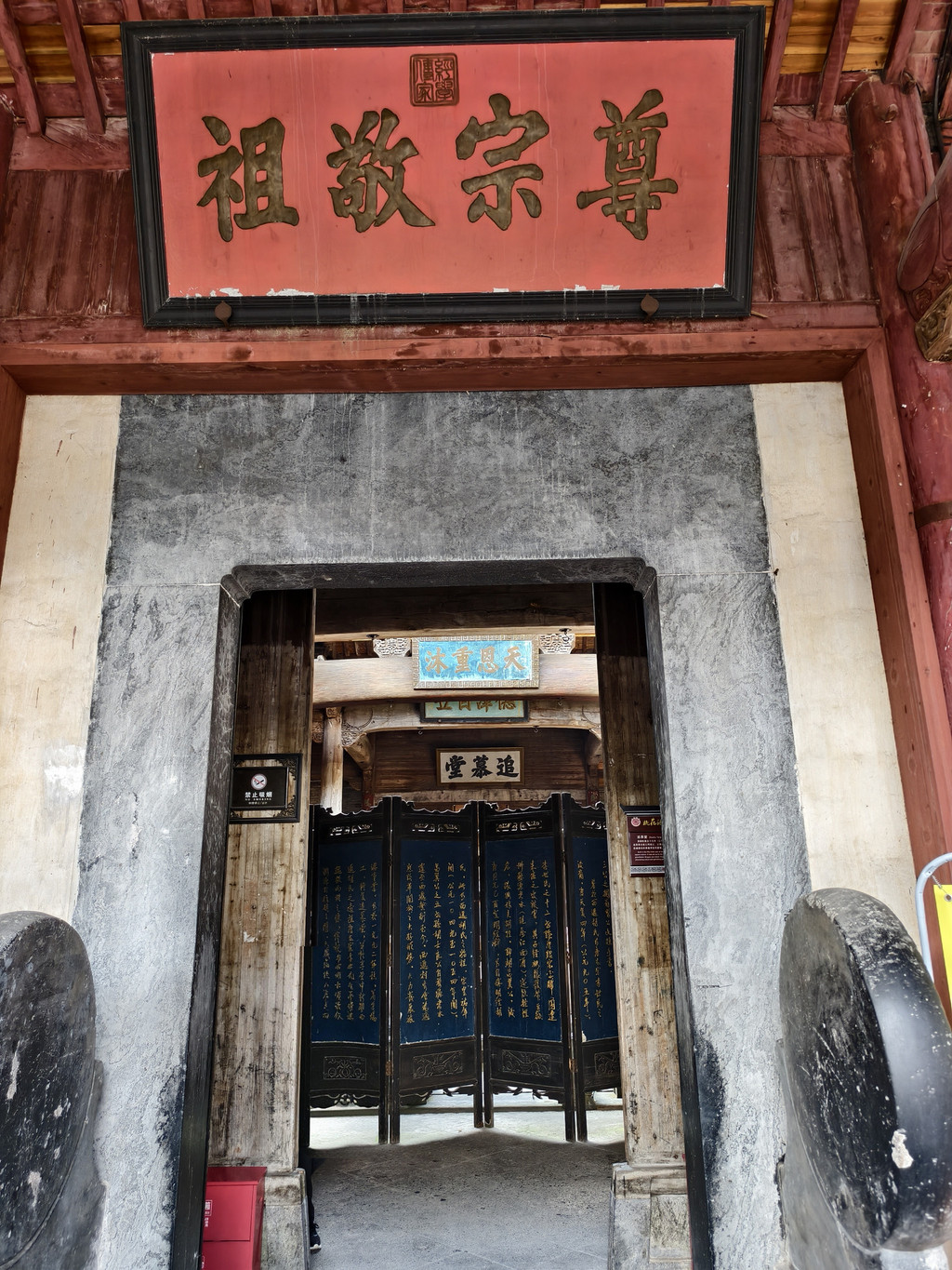 离开旷古斋,来到追慕堂。追慕堂屋顶飞檐翘角,八字型大门楼,檐下三元门外设有木栏,八字墙用整块打磨光滑的黟县大理石制成,风格独特,极为精美壮观。