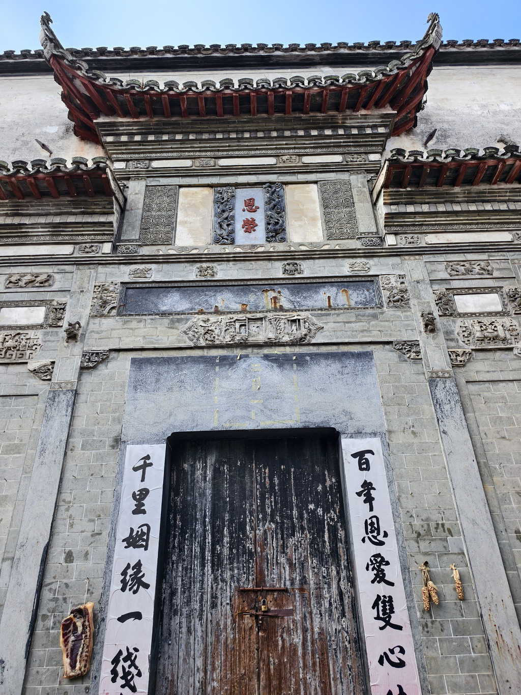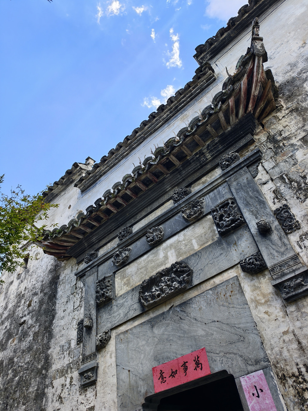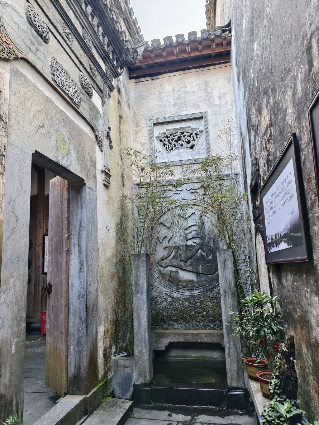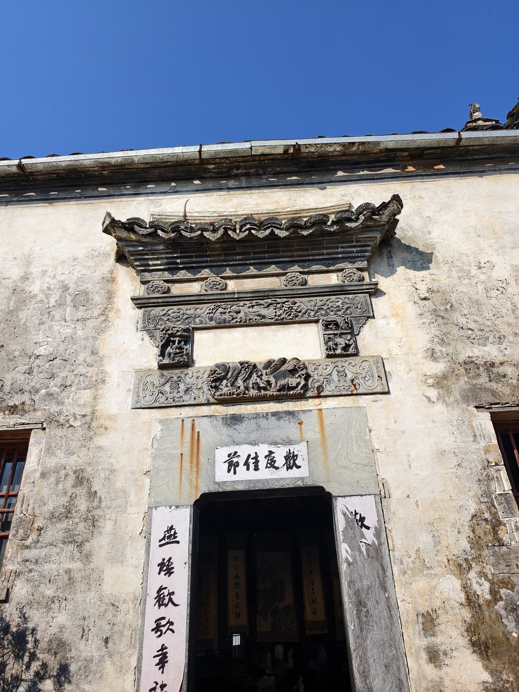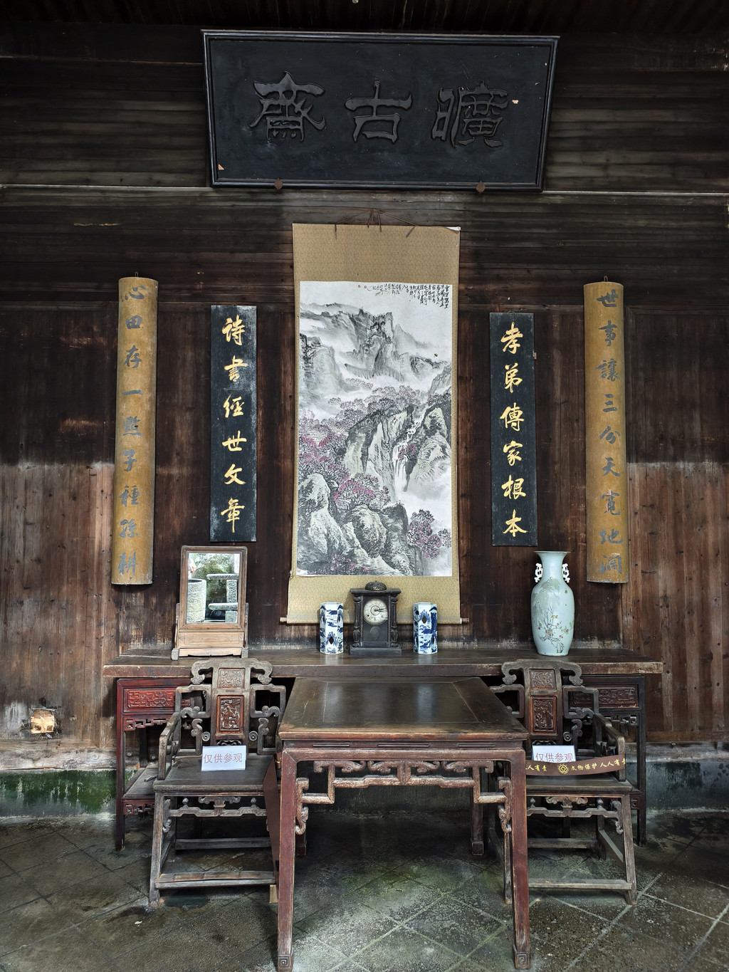 离开旷古斋,来到追慕堂。追慕堂屋顶飞檐翘角,八字型大门楼,檐下三元门外设有木栏,八字墙用整块打磨光滑的黟县大理石制成,风格独特,极为精美壮观。