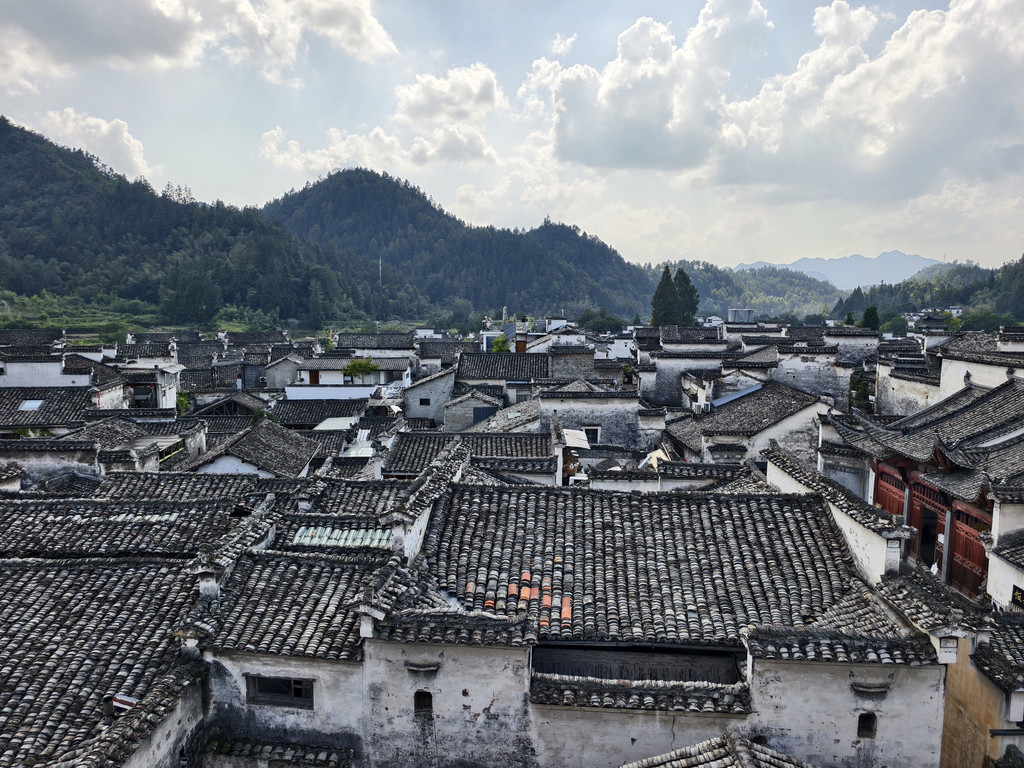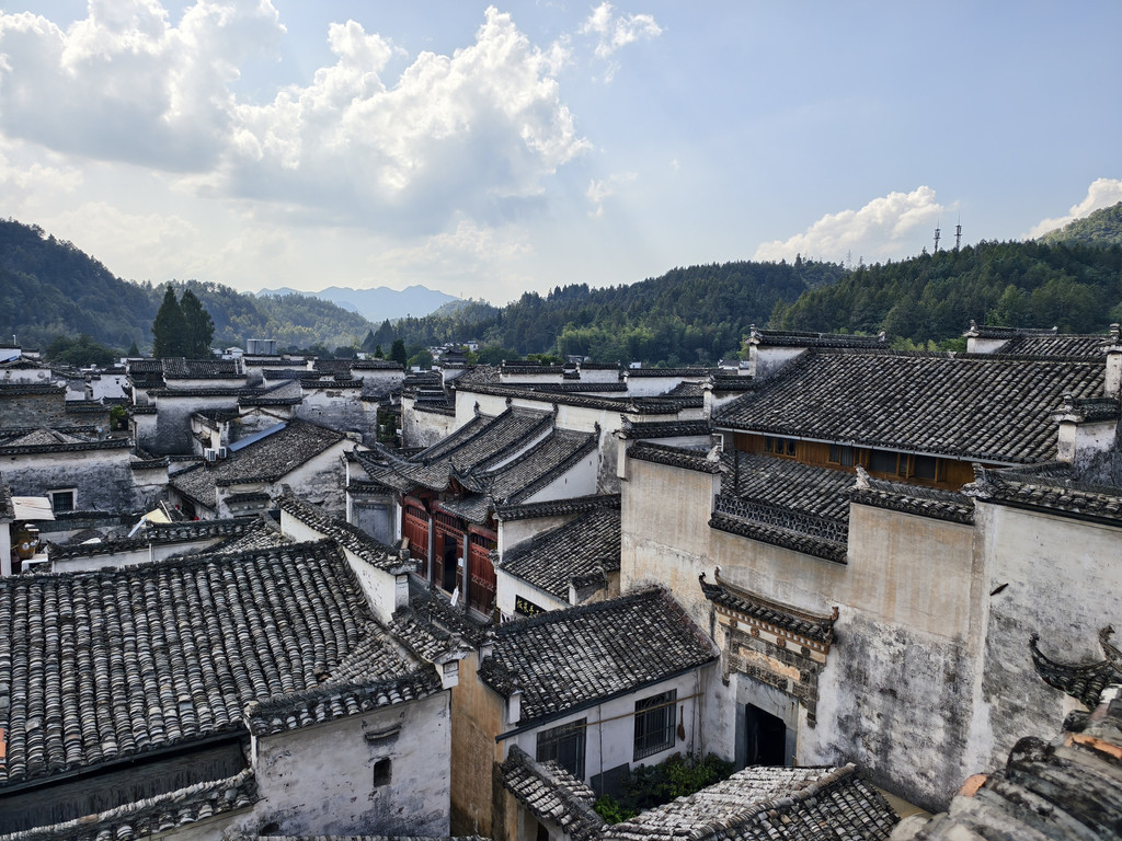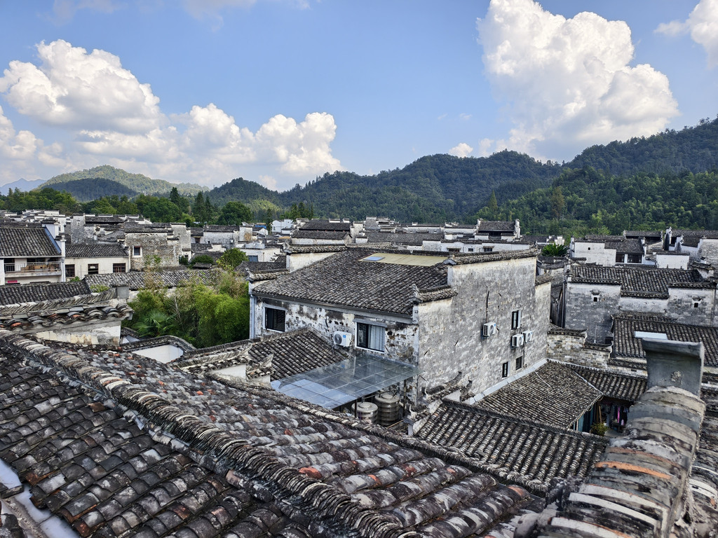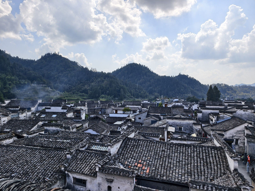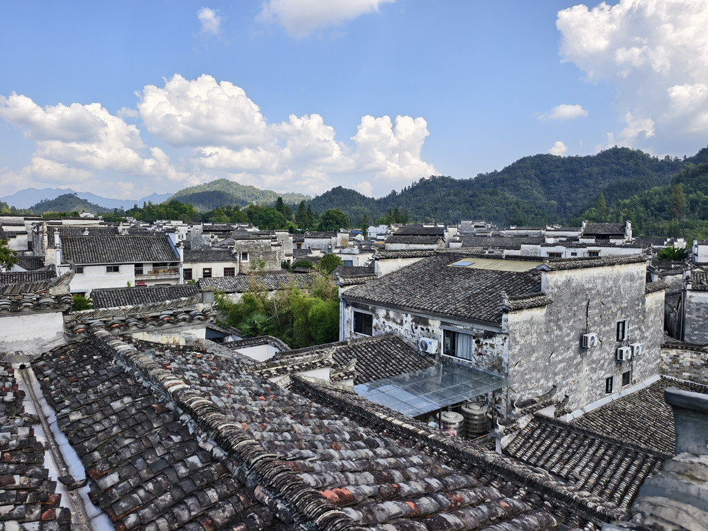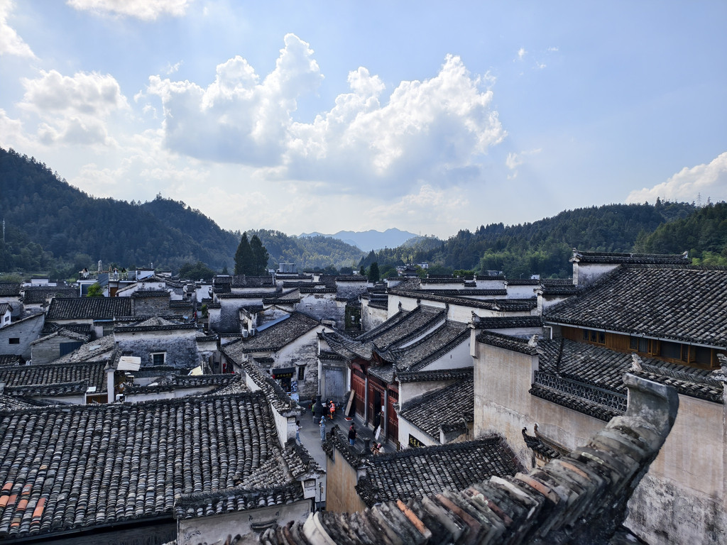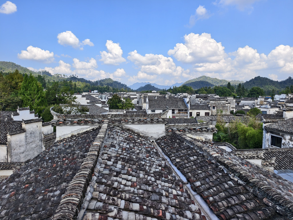 离开追慕堂,沿街前行,一家利用故民居改建的餐馆兼民俗老板热诚介绍其屋顶阳台可远瞰西递全景。遂上楼来到屋顶阳台,鳞次栉比的西递村落全景映入眼帘。