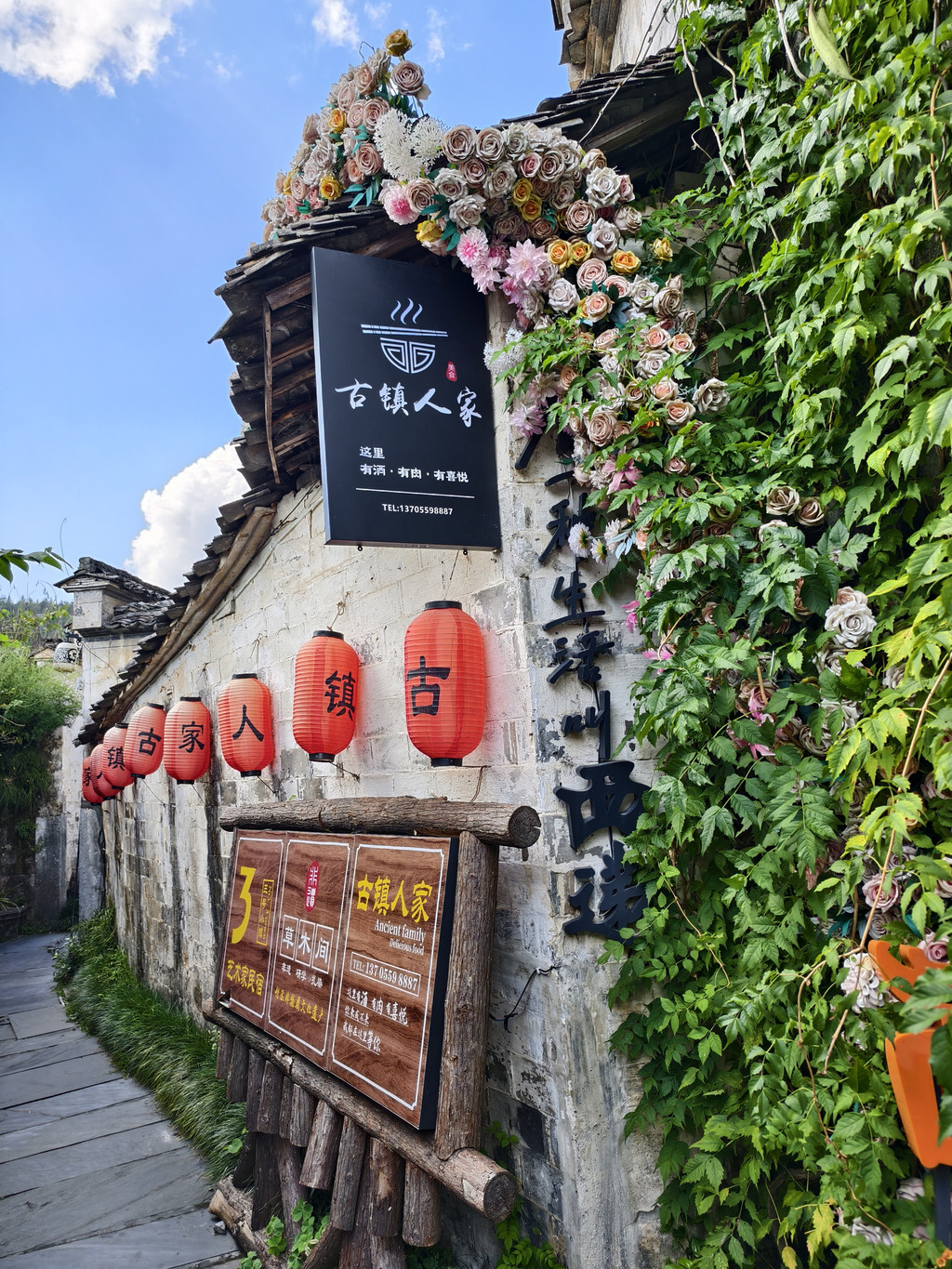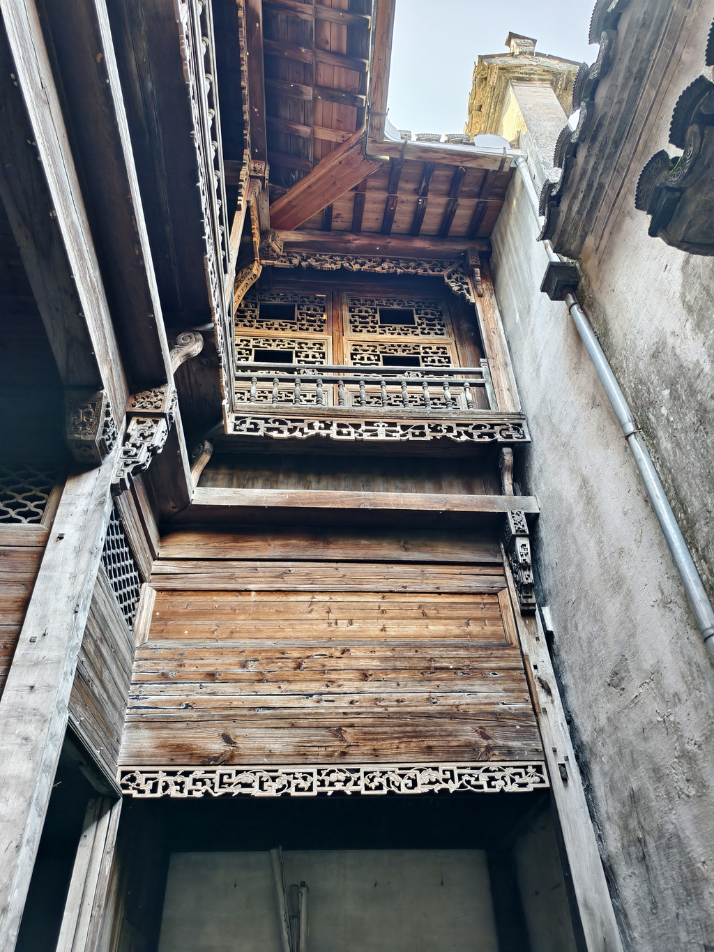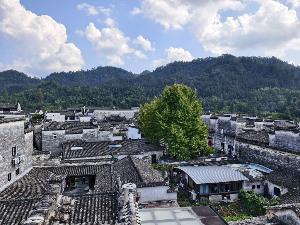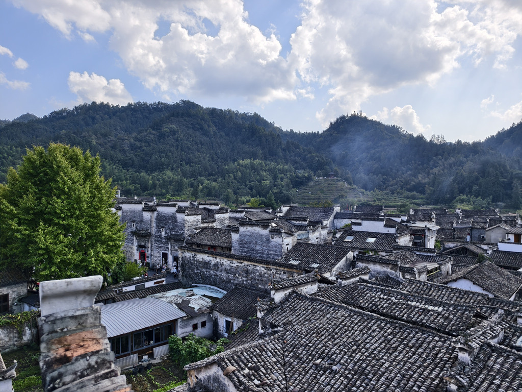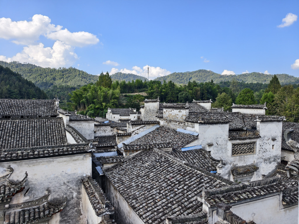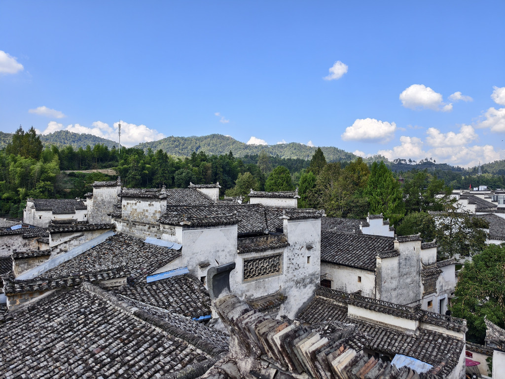 离开追慕堂,沿街前行,一家利用故民居改建的餐馆兼民俗老板热诚介绍其屋顶阳台可远瞰西递全景。遂上楼来到屋顶阳台,鳞次栉比的西递村落全景映入眼帘。