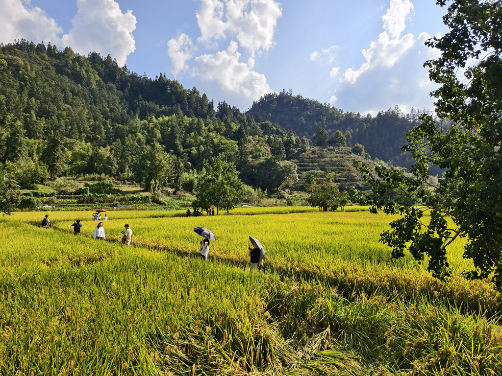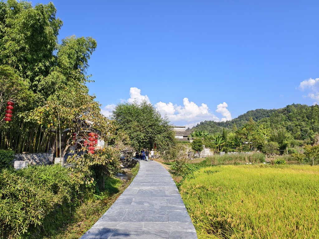 村外是金色的稻田和远山,暧暧远人村,依依墟里烟,陶渊明笔下的乡村诗意在此尽显。
