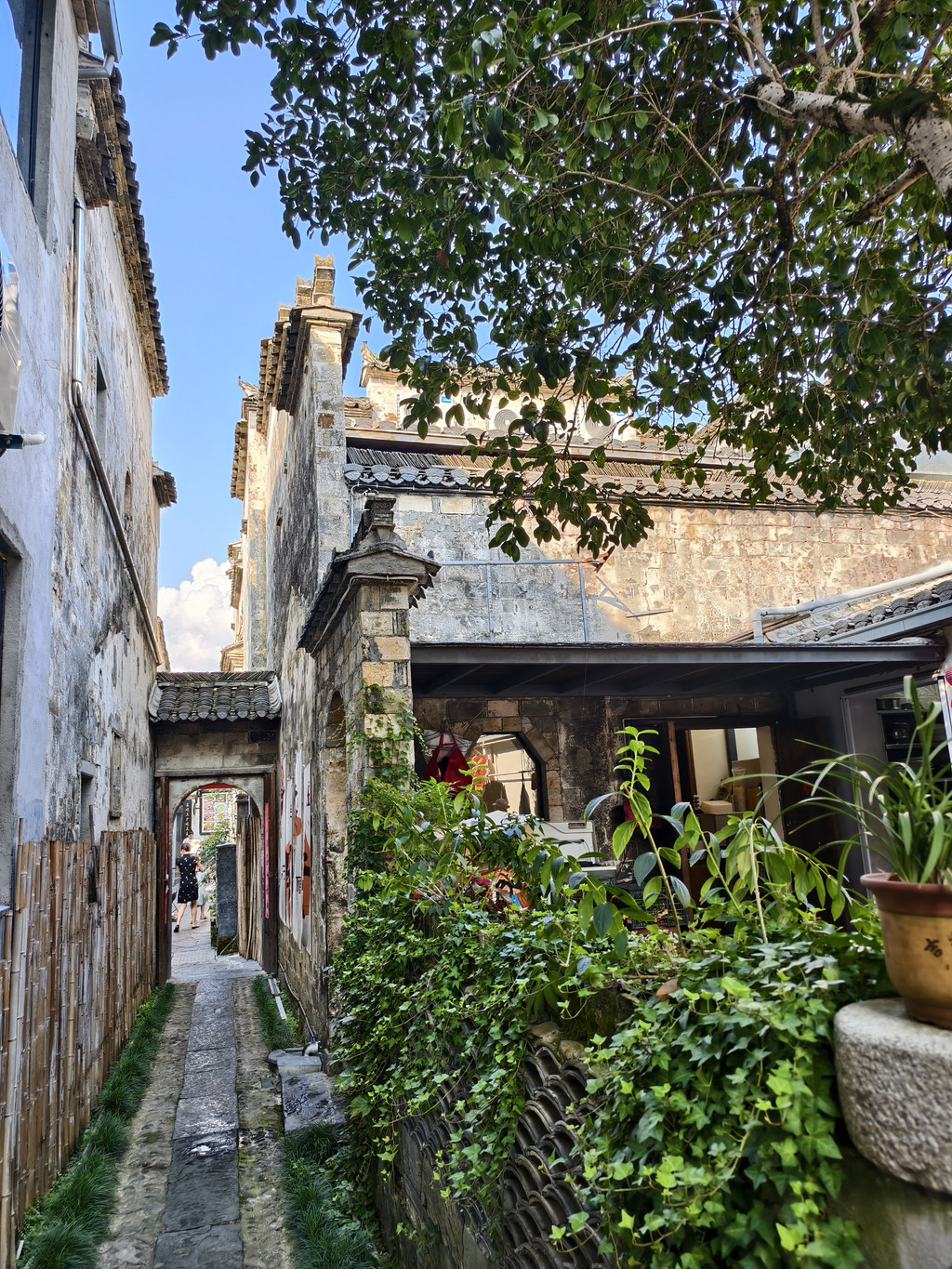 来到笃谊庭,这座宅第又称枕石小筑,建于清道光年间(公元1821年—1850年),庭院大门为砖砌八字门楼,上嵌砖雕“紫气东来”横额,大门里向门亭嵌有画轴形石雕门额“枕石小筑”四字。门亭两侧建有花瓶,绿叶形小门洞,分别嵌有“玉壶”、“莺春”砖雕门额。