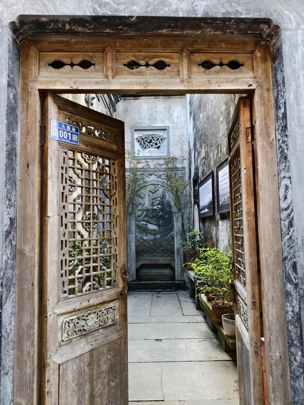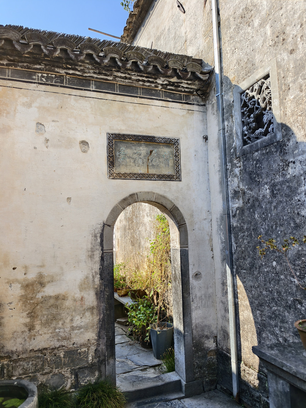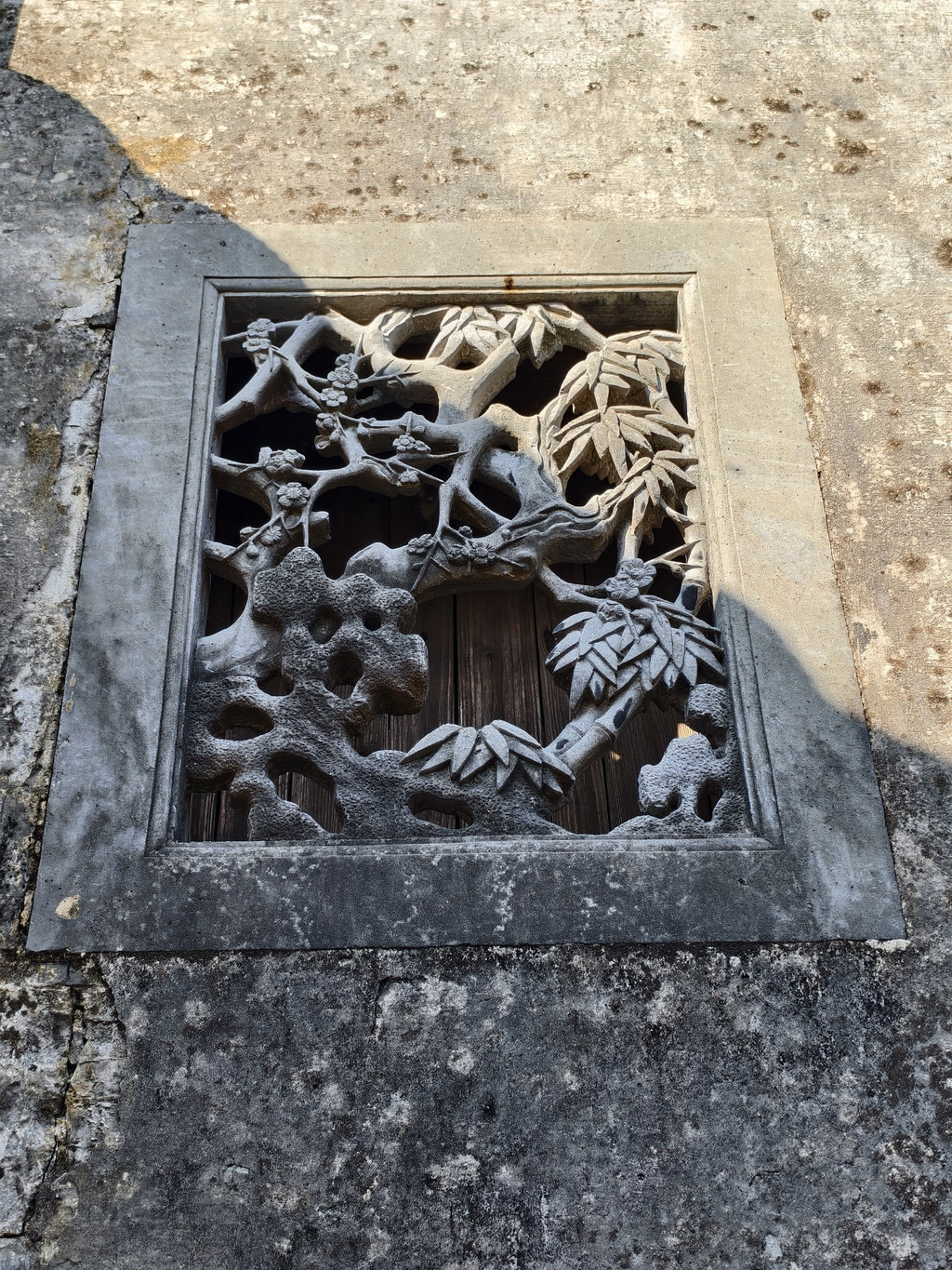 中院住宅大门两侧墙上各嵌有一个石雕漏窗,左边是“松石图”,两株奇松斜伸于嶙峋怪石之上,傲然挺拔;右边是“竹梅图”,婆娑幻影与傲立劲梅相错,显得高雅别致。