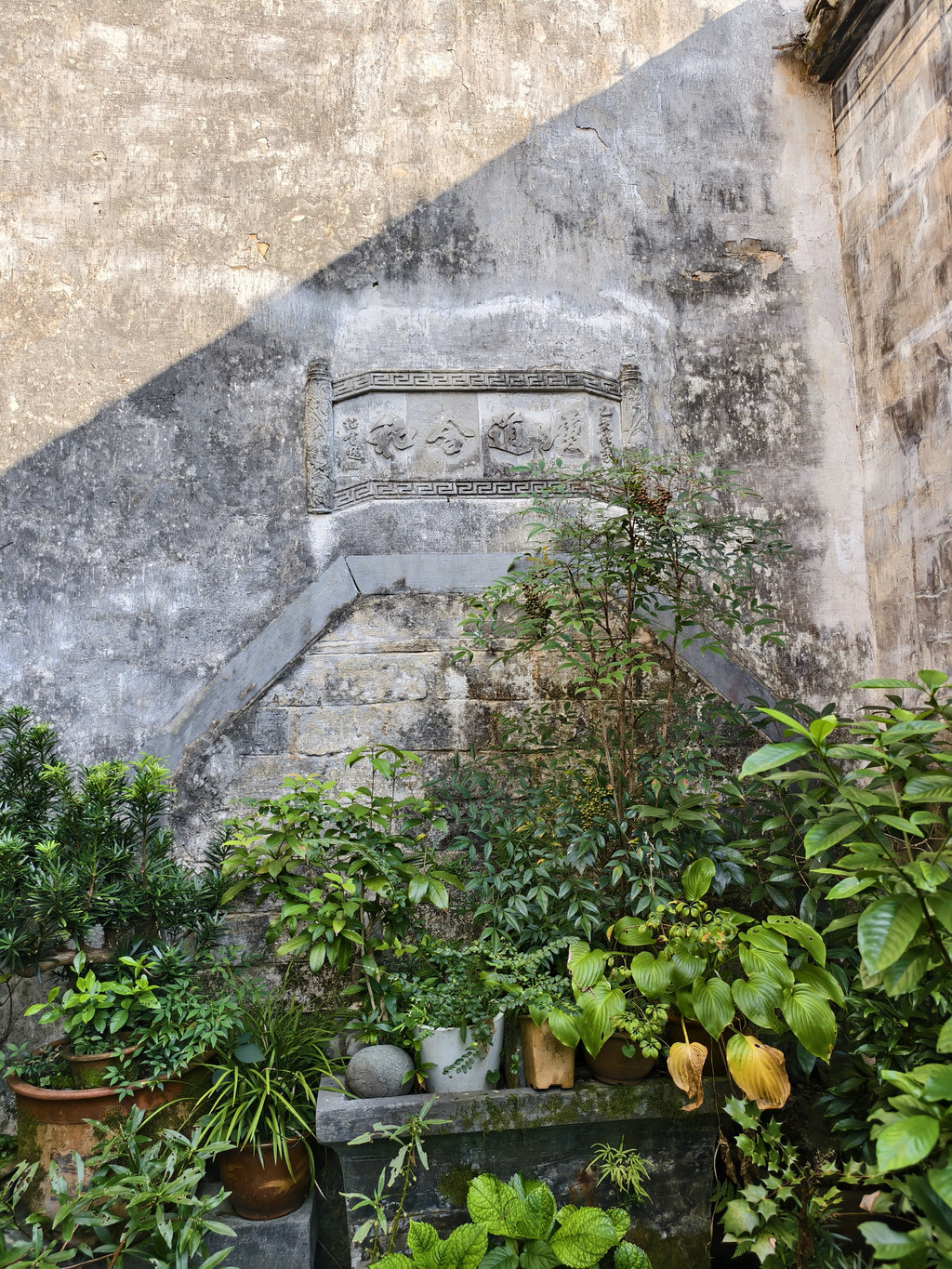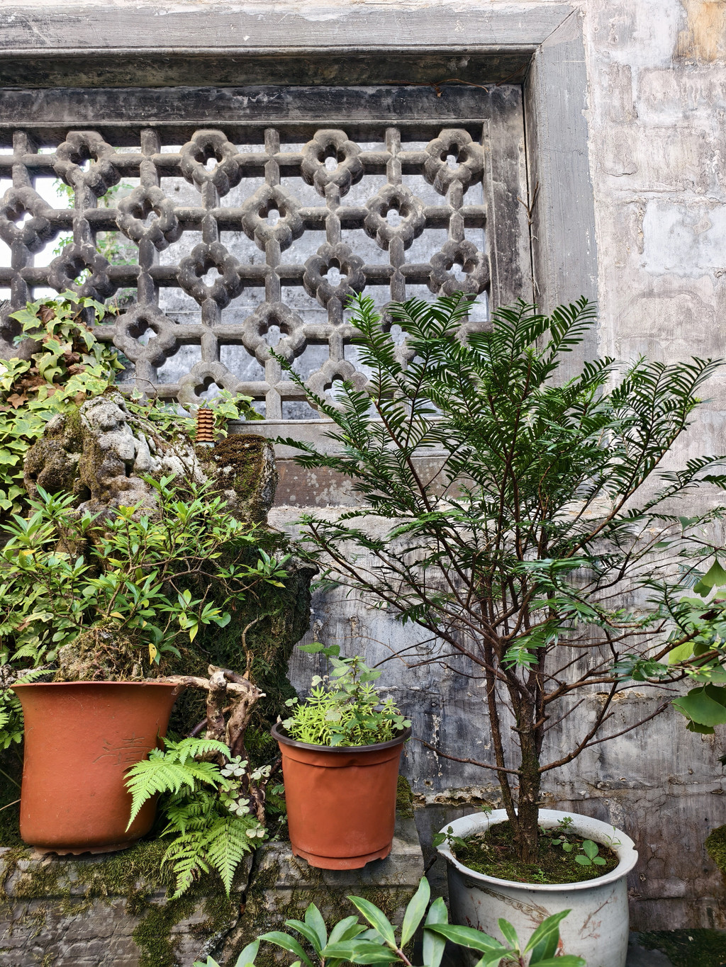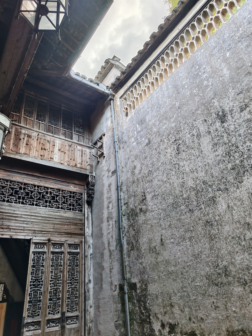 中院住宅大门两侧墙上各嵌有一个石雕漏窗,左边是“松石图”,两株奇松斜伸于嶙峋怪石之上,傲然挺拔;右边是“竹梅图”,婆娑幻影与傲立劲梅相错,显得高雅别致。