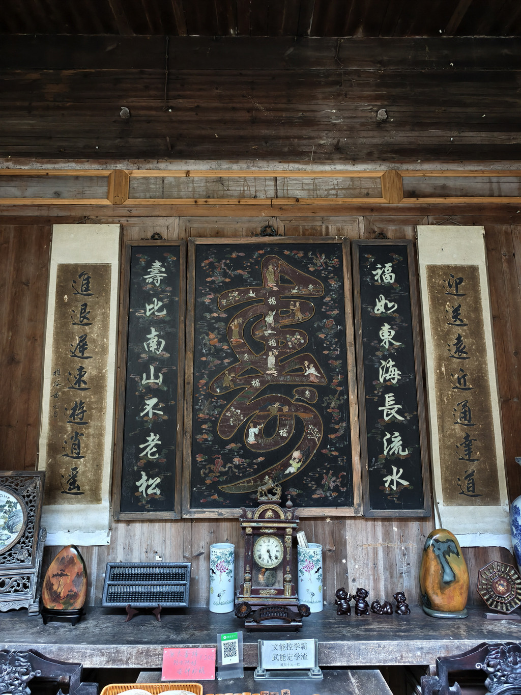 厅堂两侧有12块雕花木板有清康熙年间古黟书法家黄元治书宋欧阳修《醉翁亭记》的书法漆雕,我没有注意到,倒是留意到厅堂上的寿字屛。