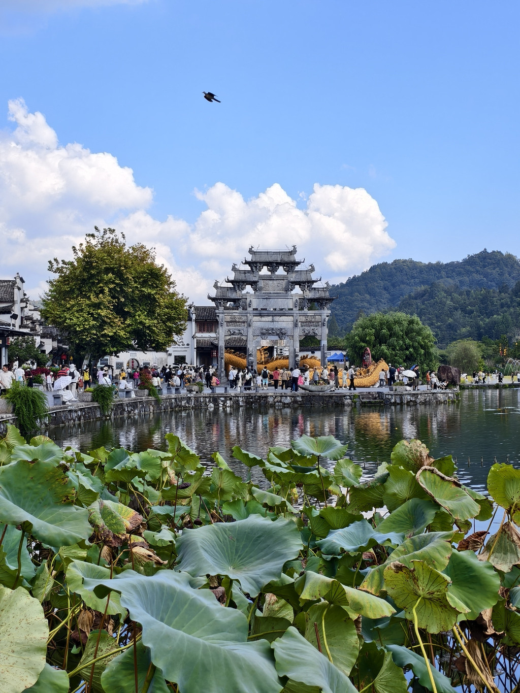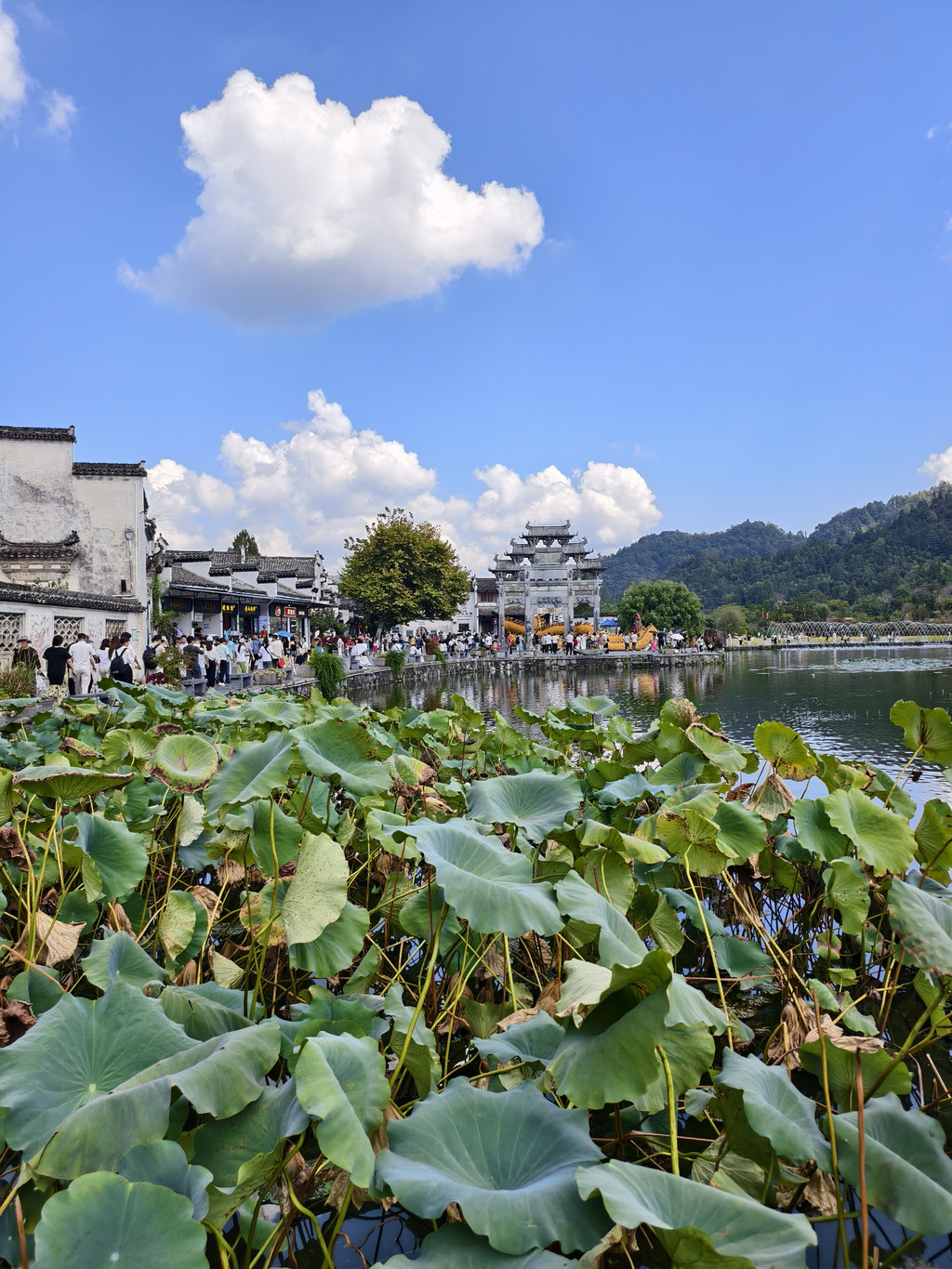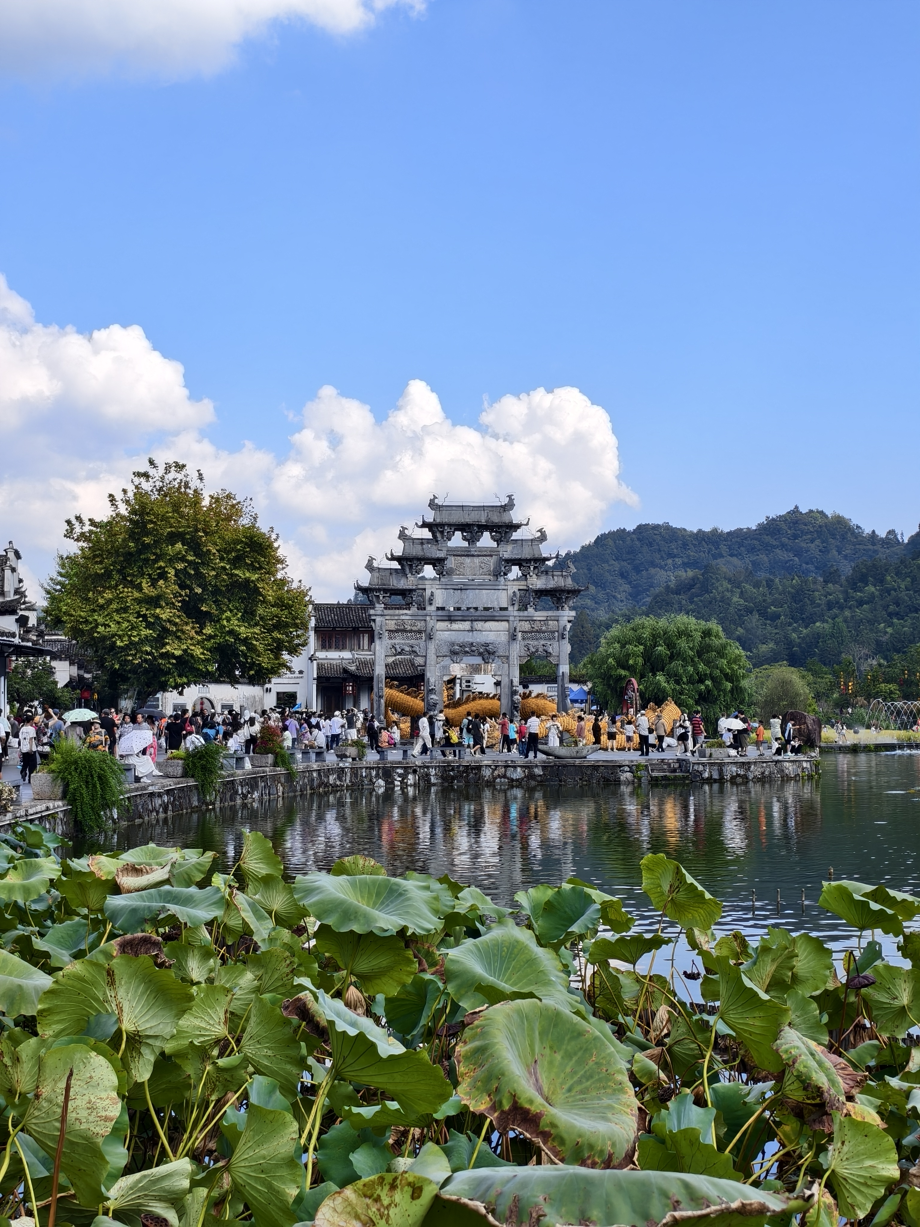 与宏村相似,西递村口也有一片宽阔的水面,明经湖湖面上还有残荷,若是盛夏该是一幅“接天莲叶无穷碧,映日荷花别样红”的美景。